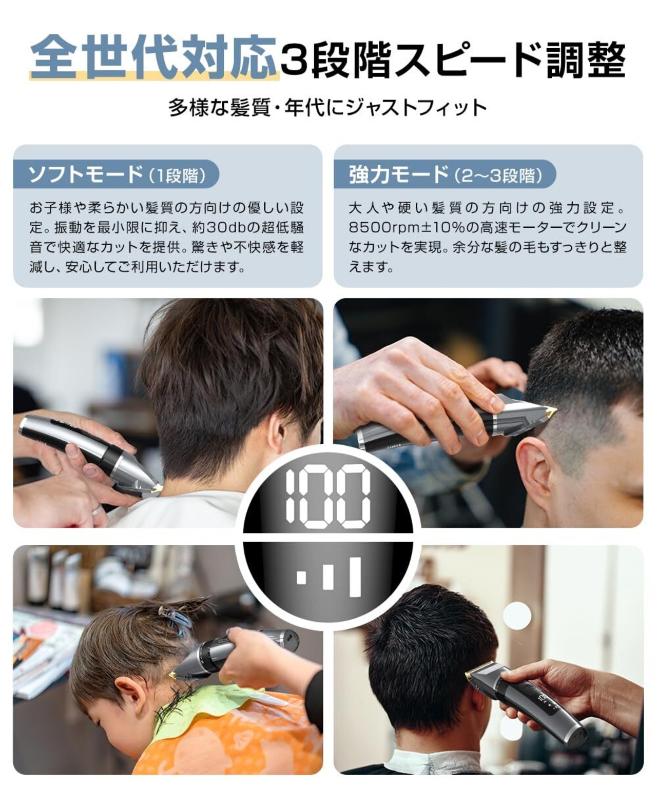 【パワフル&低騒音設計・3段階スピード調整】 電動バリカン に高性能モーターを搭載し、切れ味抜群ながら低騒音設計。自宅でも早朝・深夜を問わず快適に使用可能。3段階スピード調整機能付きで、髪質やスタイルに応じた最適なカットが可能。