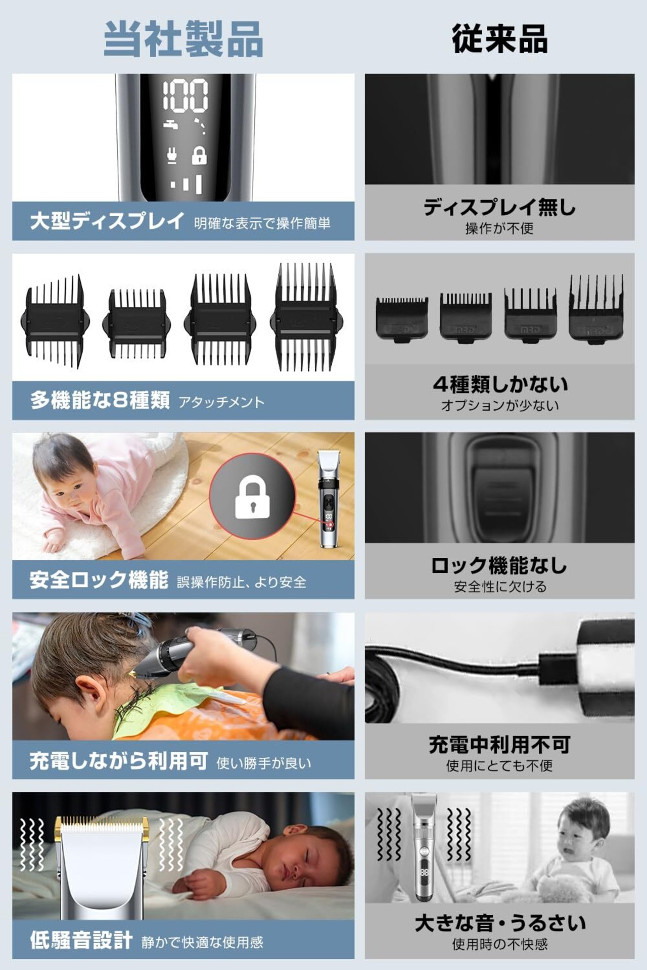 【LED大型ディスプレイ&安全ロック機能】 バリカン のバッテリー残量、スピードモード、充電状態を一目で確認できるLEDディスプレイを搭載。さらに、安全ロック機能付きで、持ち運びや保管時の誤作動を防ぎ、お子様のいる家庭でも安心して使用できます。