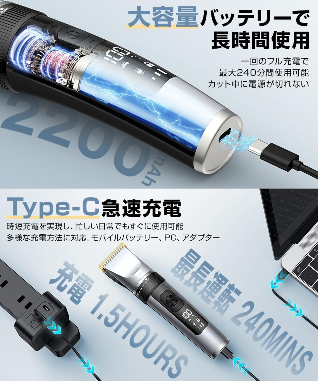 【業界最大級バッテリー搭載・最長240時間稼働】 バリカン コードレス 仕様で自由自在!高性能リチウムイオンバッテリーを搭載し、一度のフル充電で最大240時間使用可能。忙しい日々の中でも頻繁な充電不要で、長時間の使用にも安心。Type-C急速充電対応で、わずか数時間の充電で長時間の稼働を実現。