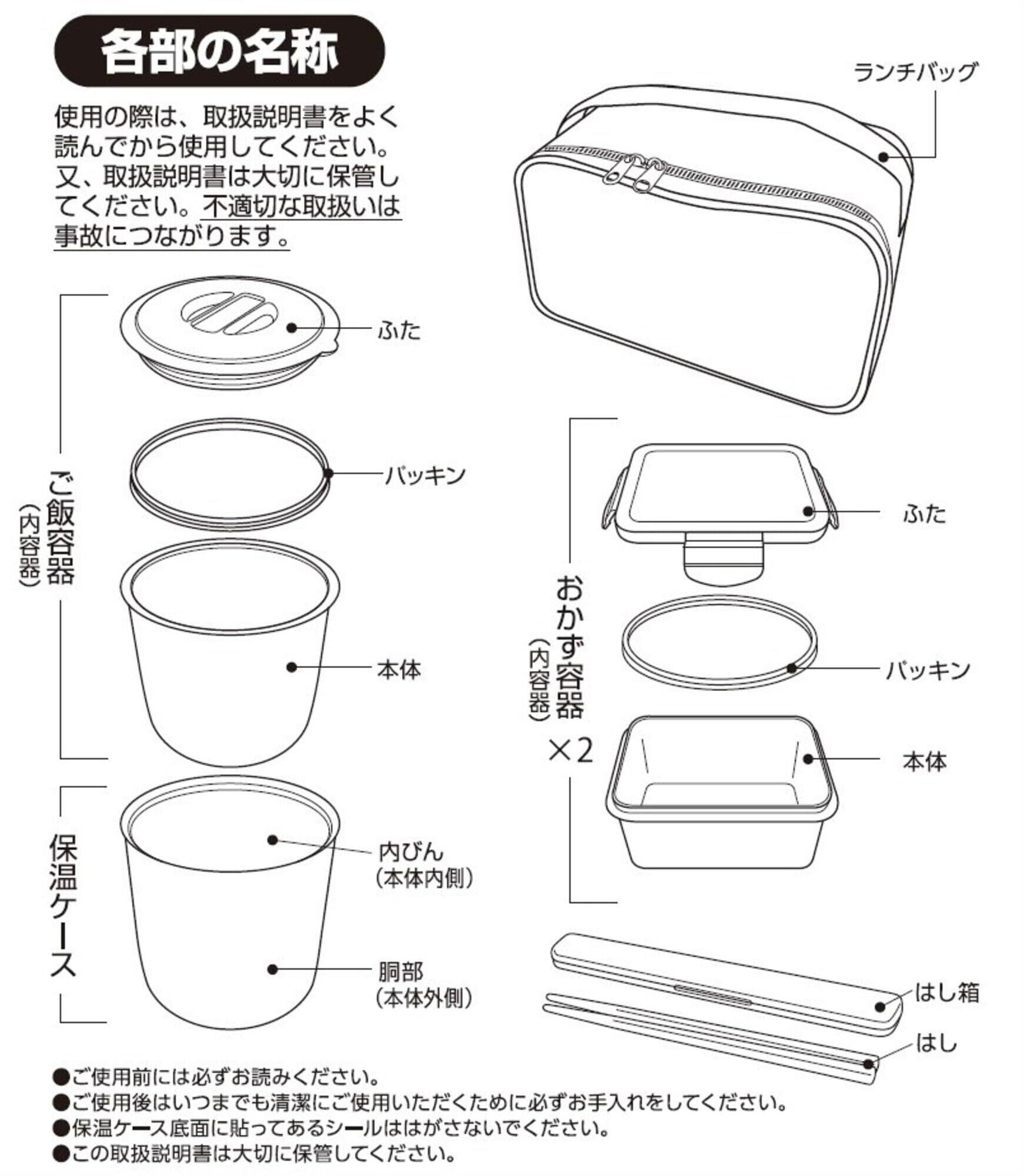 素材・材質:保温ケース(内びん)/ステンレス鋼、(胴部)/ステンレス鋼(アクリル樹脂塗装)、ご飯容器(本体)/ポリピロピレン(耐熱温度140度・耐冷温度-20度)、(ふた)/ポリプロピレン(発泡スチロール内臓)(耐熱温度80度・耐冷温度-20度)、(パッキン)/シリコーンゴム(耐熱温度180度・耐冷温度-20度)、おかず容器(本体・ふた)/ポリプロピレン(耐熱温度140度・耐冷温度-20度)、(パッキン)/シリコーンゴム(耐熱温度180度・耐冷温度-20度)、はし・はし箱/ABS樹脂(耐熱温度80度・耐冷温度-20度)、ランチバッグ(本体・取っ手)/ポリエステル、(中芯)/ポリエチレン