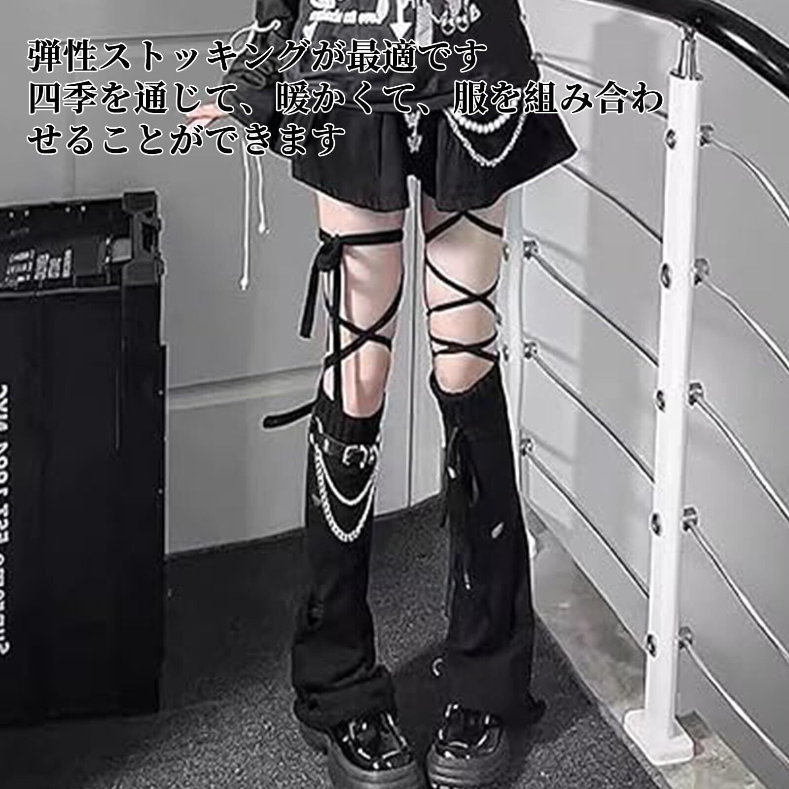 Doyime ルーズソックス 黒 レッグウォーマー レディース 地雷系 レッグウォーマー ふわふわ 冷え対策 レッグカバー 原宿パンク レッグカバー ベルト付き チェーン 破れ穴 美脚 Lolita ガール系 原宿風 JK サブカル系 Y2K 制服 冷え対策