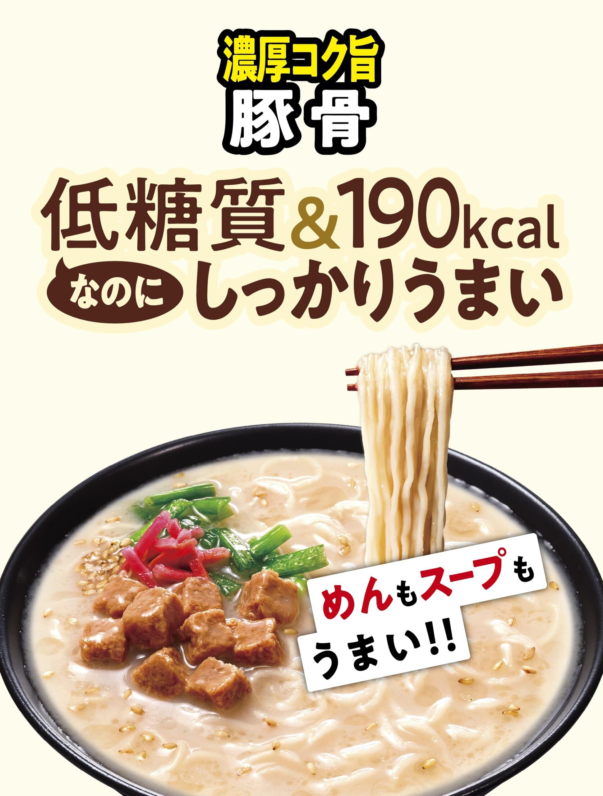 ●「思った以上に普通のカップ麺と変わらないおいしさ・満足感がある!」と好評のロカボNOODLESから新メニュー「濃厚コク旨豚骨」が新発売! ●「低糖質で200kcal未満なのに、しっかりうまい!」ポークオイルをベースにガーリックの香りを効かせた濃厚でコク旨な豚骨ラーメンです。 ●前日食べ過ぎた、その日の晩に外食がある、な時でも罪悪感なく食べられます! ●麺:糖質をカットした明星オリジナルの ンフライ麺。豚骨と相性の良い生姜をねり込みました。 ●スープ:ポークエキスをベースに、チキンエキス、ガーリック、 油 を合わせたスープ。 ●具材:プロテインキューブ、ゴマ、ニラ、 紅生姜チップの組み合わせ。