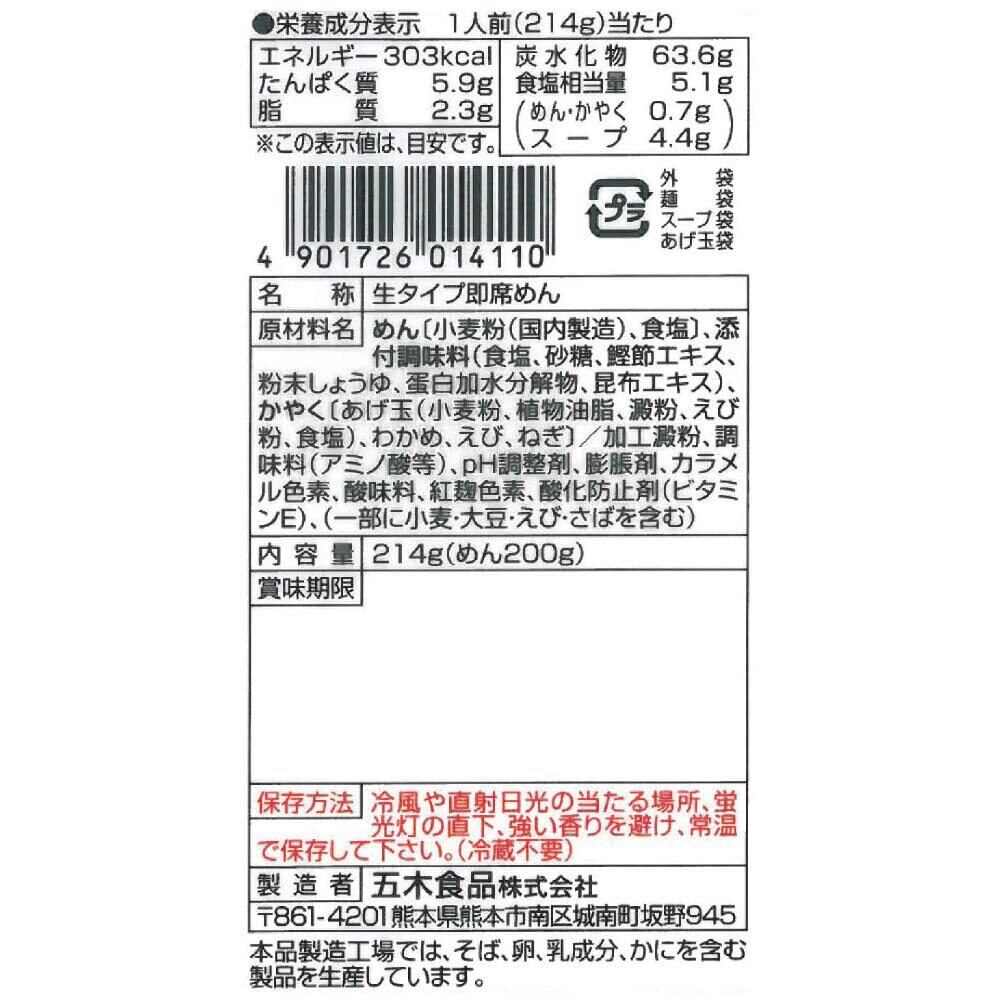 めん〔小麦粉(国内製造)、食塩〕、添付調味料(食塩、砂糖、鰹節エキス、粉末しょうゆ、蛋白加水分解物、昆布エキス)、かやく〔あげ玉(小麦粉、植物油脂、澱粉、えび粉、食塩)、わかめ、えび、ねぎ〕/加工澱粉、調味料(アミノ酸等)、pH調整剤、膨張剤、カラメル色素、酸味料、紅麹色素、酸化防止剤(ビタミンE)、(一部に小麦・大豆・えび・さばを含む)