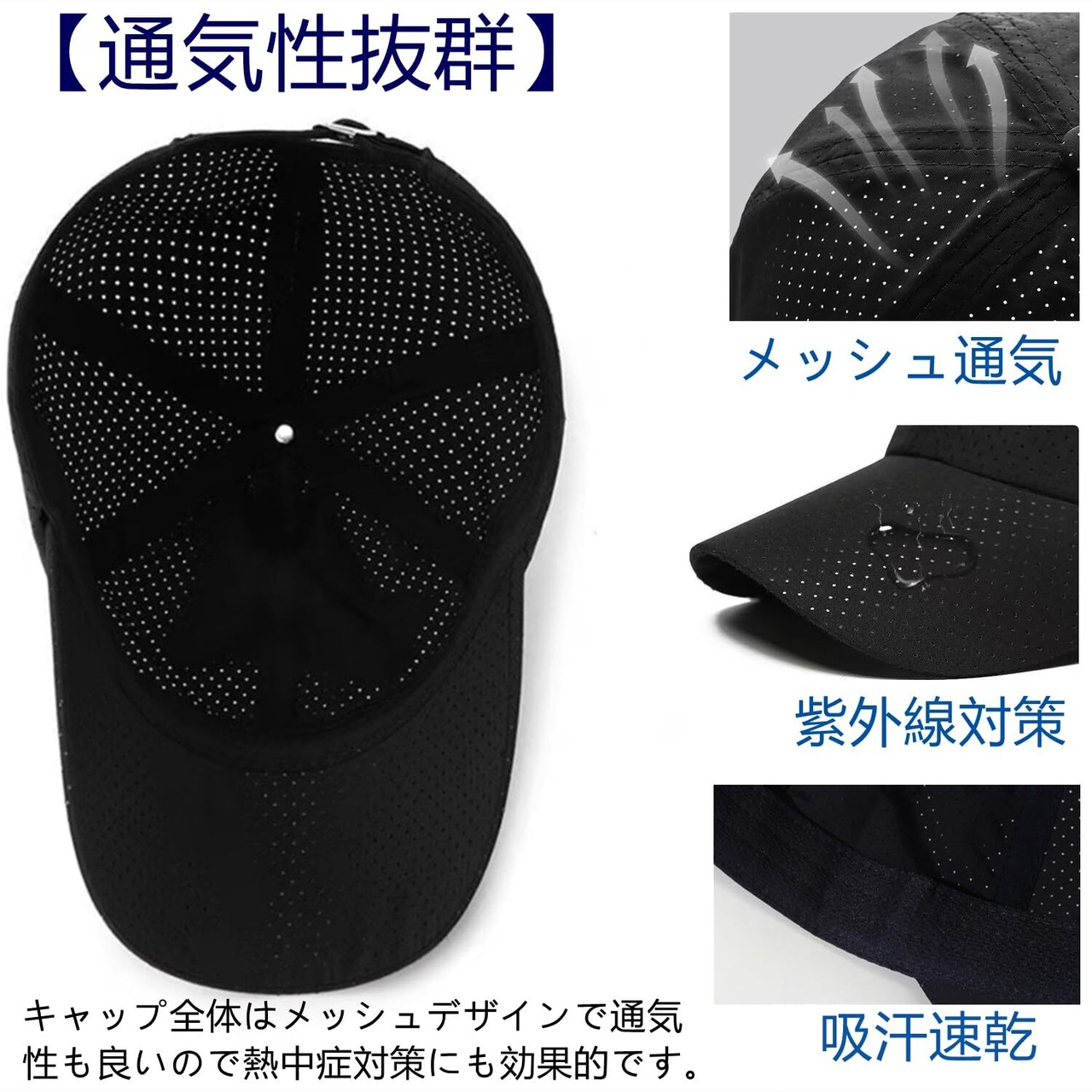 【通気性抜群メッシュ速乾素材】:通気性の良い薄手の全メッシュ素材で作られており。頭部を圧迫することもありません。キャップ全体はメッシュデザインで通気性も良いので熱中症対策にも効果的です。着用中は帽子内の蒸気をメッシュの穴から外に逃がし、新鮮な外気を取り入れることで蒸れを軽減し、快適に使用して頂けます。