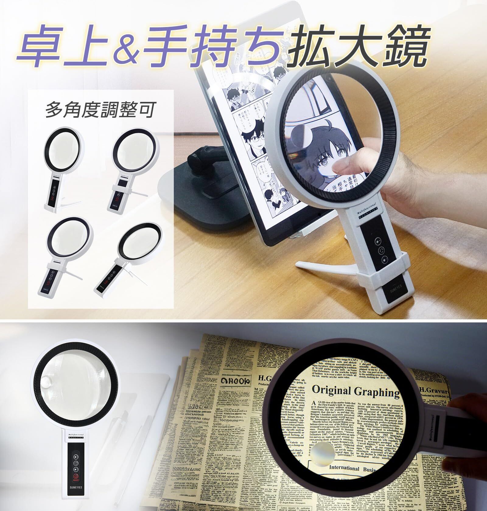 【手持ち&卓上の両用設計】手持ち式としての使用はもちろん、付属のスタンドを取り付けることで卓上式としても利用可能。自由に角度調節ができるため、読書や模型製作、ネイルなど、さまざまなシーンでハンズフリー活用できます。
