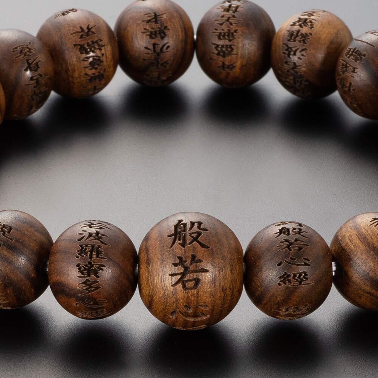 般若心経は仏教の教えを集約した経典で、読むことによって膨大な経典の大般若経600巻全てを読んだに等しい功徳が得られ、一切の苦厄が取り除かれるといわれています。シックな色合いの栴檀に、般若心経を細かく丁寧に彫り込んだ、ご利益のある念珠ブレスです。10mmの大きめな主珠を使用しており、存在感がありますので、男性の方におすすめでございます。