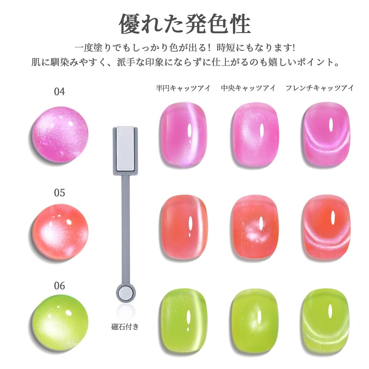 「独特なキャッツアイ効果」みずみずしく光沢があり、特別な配合とデザインにより、光の当たり方で魅力的なキャッツアイ効果を演出します。この効果は、猫の目のような輝きを持ち、ユニークで魅力的な印象を与えます。爪先が一瞬で魅力的に変わります。