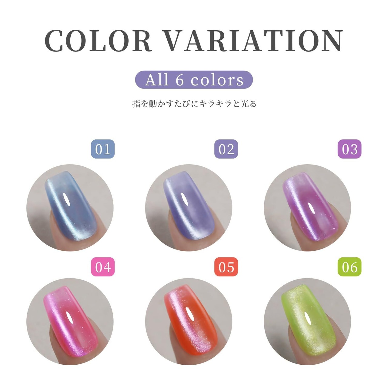 「美しい発色」6色一式が揃って、磁石であらゆる模様が楽しめ、角度によって違う表情を見せる不思議なアートができます。どの色も可愛いで無二の色味です。指先に輝く光を演出し、女性らしい魅力を引き出す。