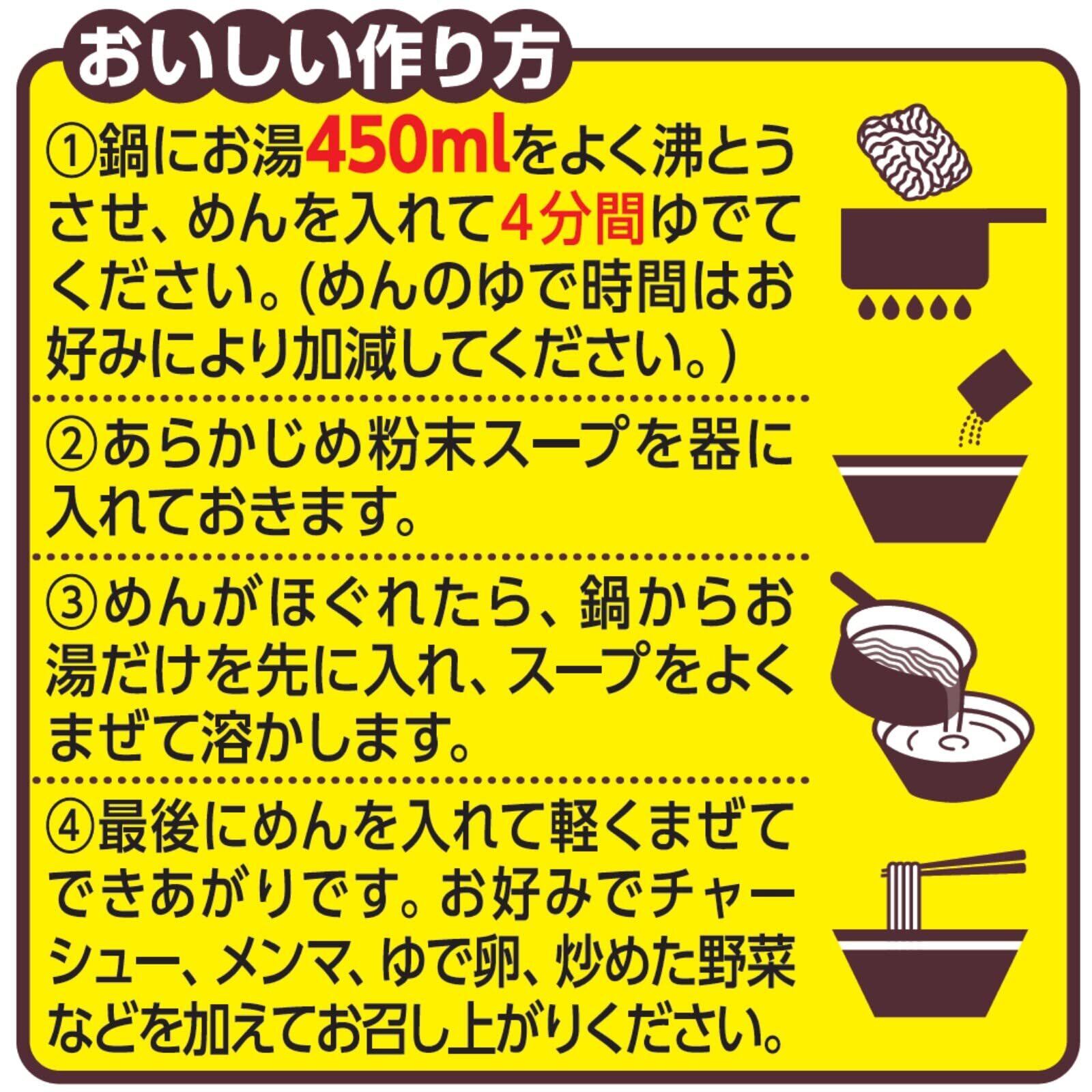 原材料: 油揚げめん(小麦粉(国内製造)、植物油脂、食塩、しょうゆ)、スープ(粉末みそ、食塩、糖類、香辛料、粉末しょうゆ、酵母エキス)/加工でん粉、調味料(アミノ酸等)、炭酸Ca、かんすい、カラメル色素、乳化剤、カロチノイド色素、香料、香辛料抽出物、酸化防止剤(ビタミンE)、酸味料、ビタミンB2、ビタミンB1、(一部に小麦・乳成分・いか・大豆を含む)