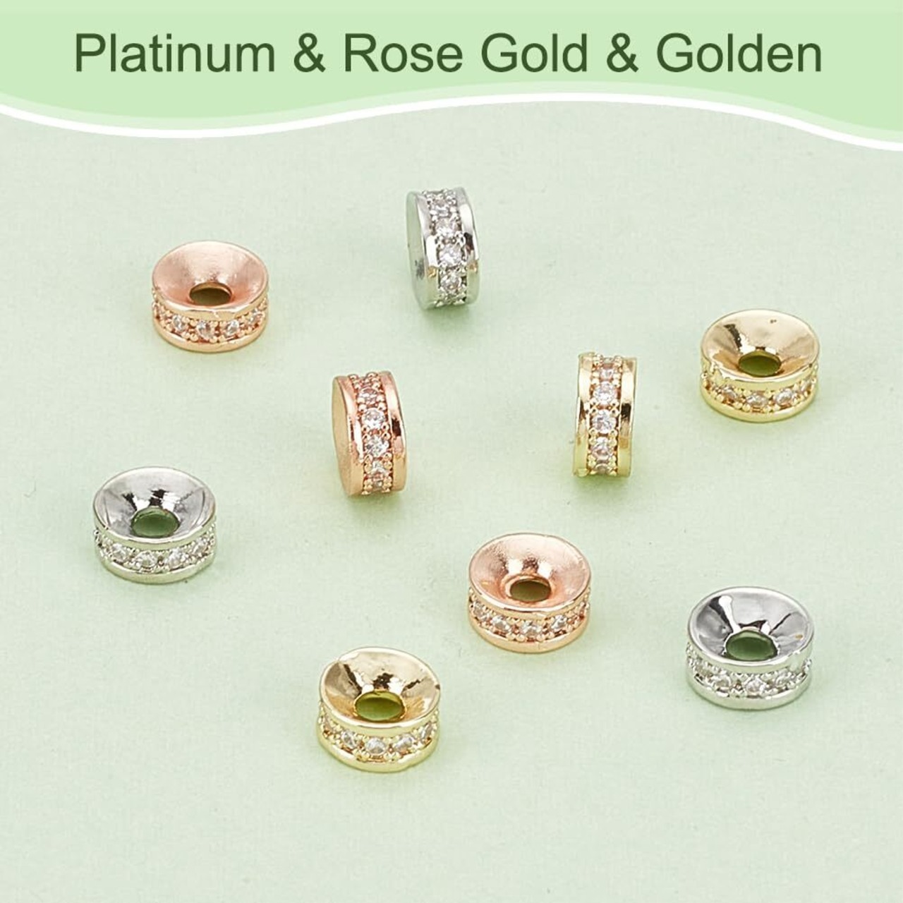 3色から選べます:ゴールド、ローズゴールド、プラチナの3色のスペーサー・ビーズが各色10個ずつ、合計30個入り。 直径約6mm、厚さ約3mm、穴の大きさ約2mm。どんなプロジェクトにも、ジュエリークラフトにも、ホームデコレーションにも最適です。