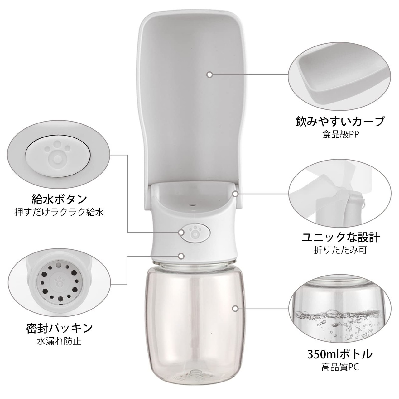 【ワンプッシュ式】 一回のお散歩で飲み切れない350mlのウォーターボトルは、片手で簡単に操作できるので、給水が楽チン!トレーいらずですぐに犬や猫にお水をあげることができます。
