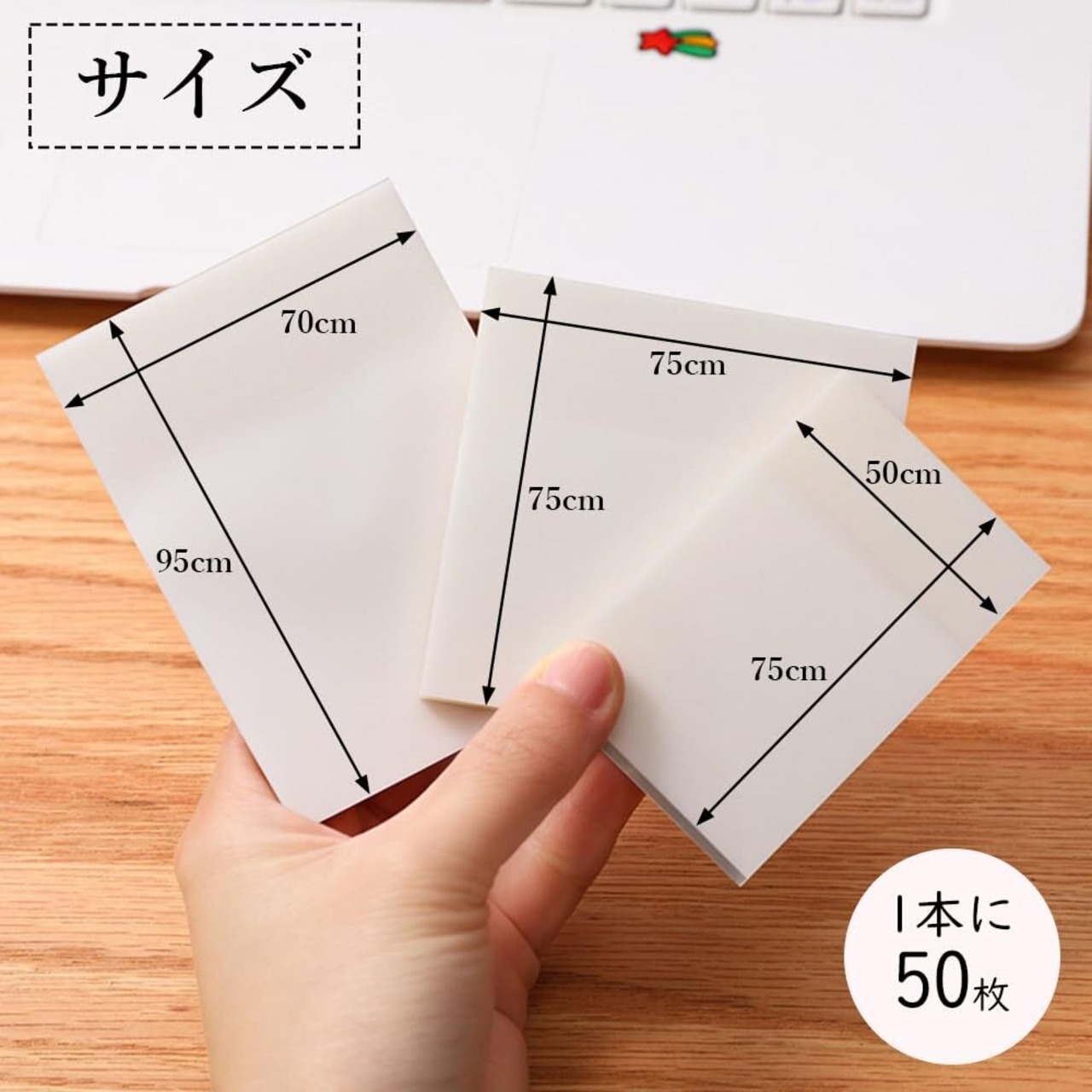 【パッケージ内容】三つサイズ(75*50mm、75*75mm、70*95mm)の白色透明付箋各2本、合計6本。