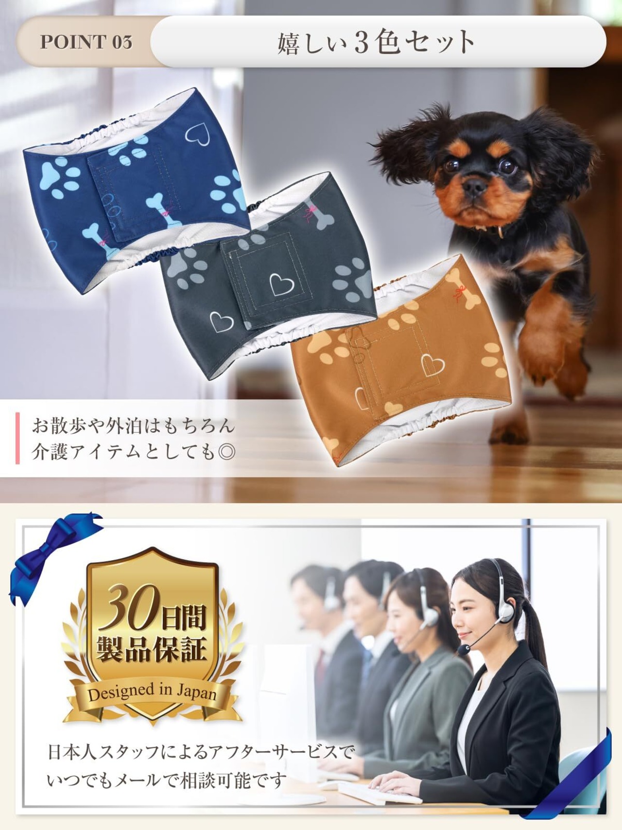 国内検査機関で吸水性と耐洗濯性試験を実施済み。日本ペット用品工業会の認定マークを取得している安心の品質です。異なるカラーを3種類ご用意致しましたので、ストック用・多頭飼い・プレゼントなどにおすすめです。マナーベルト3点セットでお届け致します。