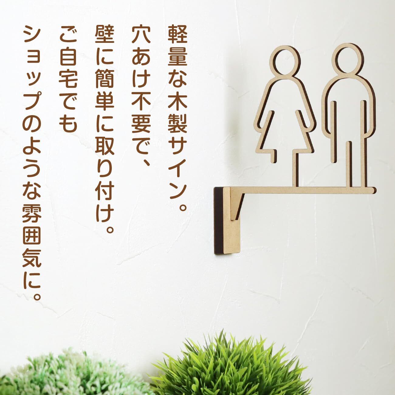 ご自宅に、ショップのような雰囲気を。 ナチュラルな木目が美しい、温もりあるトイレ用ピクトサインです。 わずか16gと超軽量のため、画鋲や両面テープでも簡単に取り付け可能。壁に穴をあける必要がなく、賃貸住宅でも安心して設置できます。 L字型の突き出しデザインで、視認性も抜群。 男女のピクトグラムをモチーフにしたシンプルかつスタイリッシュなシルエットは、ご自宅だけでなく、カフェやショップの雰囲気づくりにもぴったりです。
