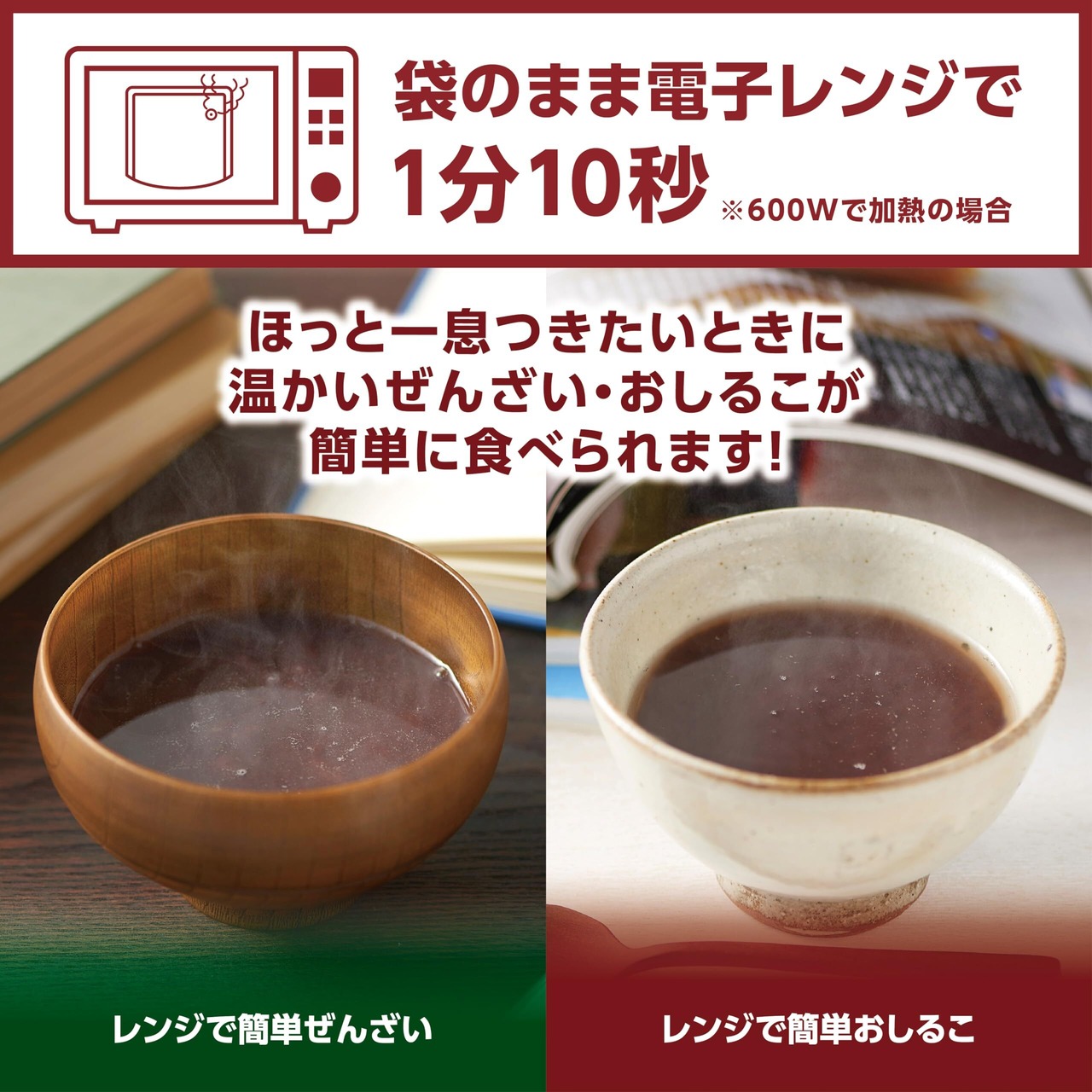 レンジで簡単1分10秒! 袋のまま電子レンジで温められる、小豆の風味豊かなぜんざいです。グラニュー糖と上白糖をブレンドし、キレの良い甘さとコクのある味に仕上げました。小豆の風味を引き出す、まろやかな塩味が特徴の沖縄県久米島「球美の塩」を使用しています。冬は温めて、夏は冷やして「冷やしぜんざい」としてもお楽しみいただけます。