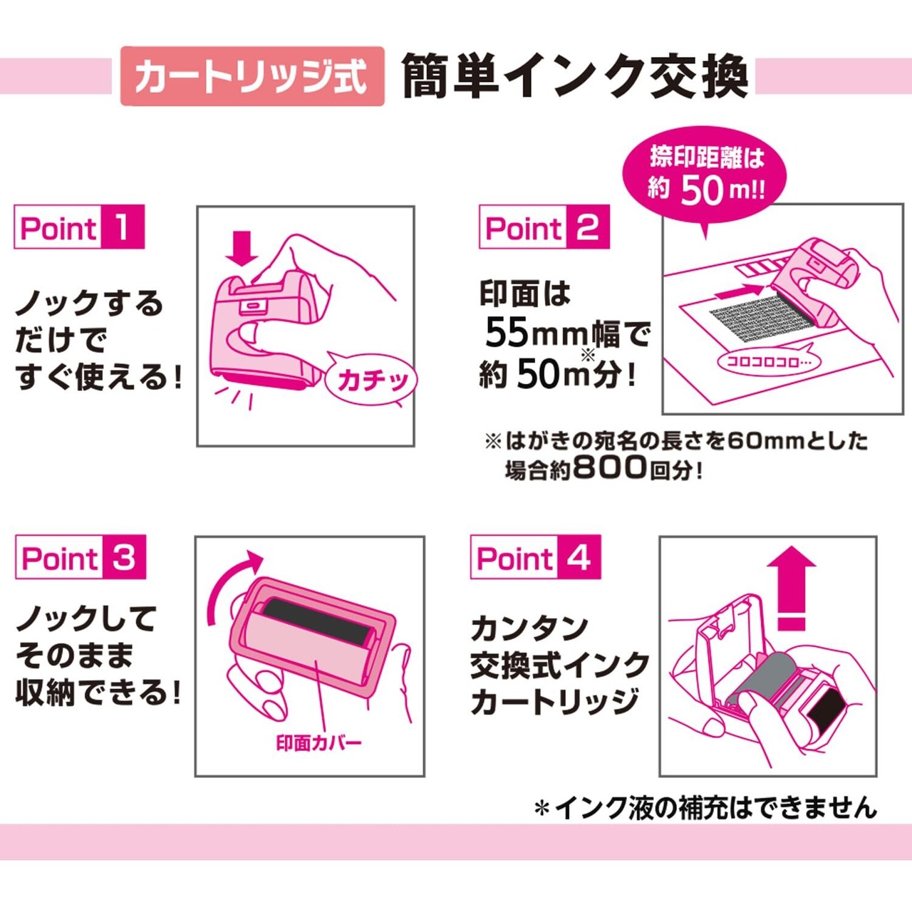 材質:本体=PS・ABS・POM、カートリッジ=ABS・POM・PE、インク:油性顔料 / ※インク液の補充はできません。