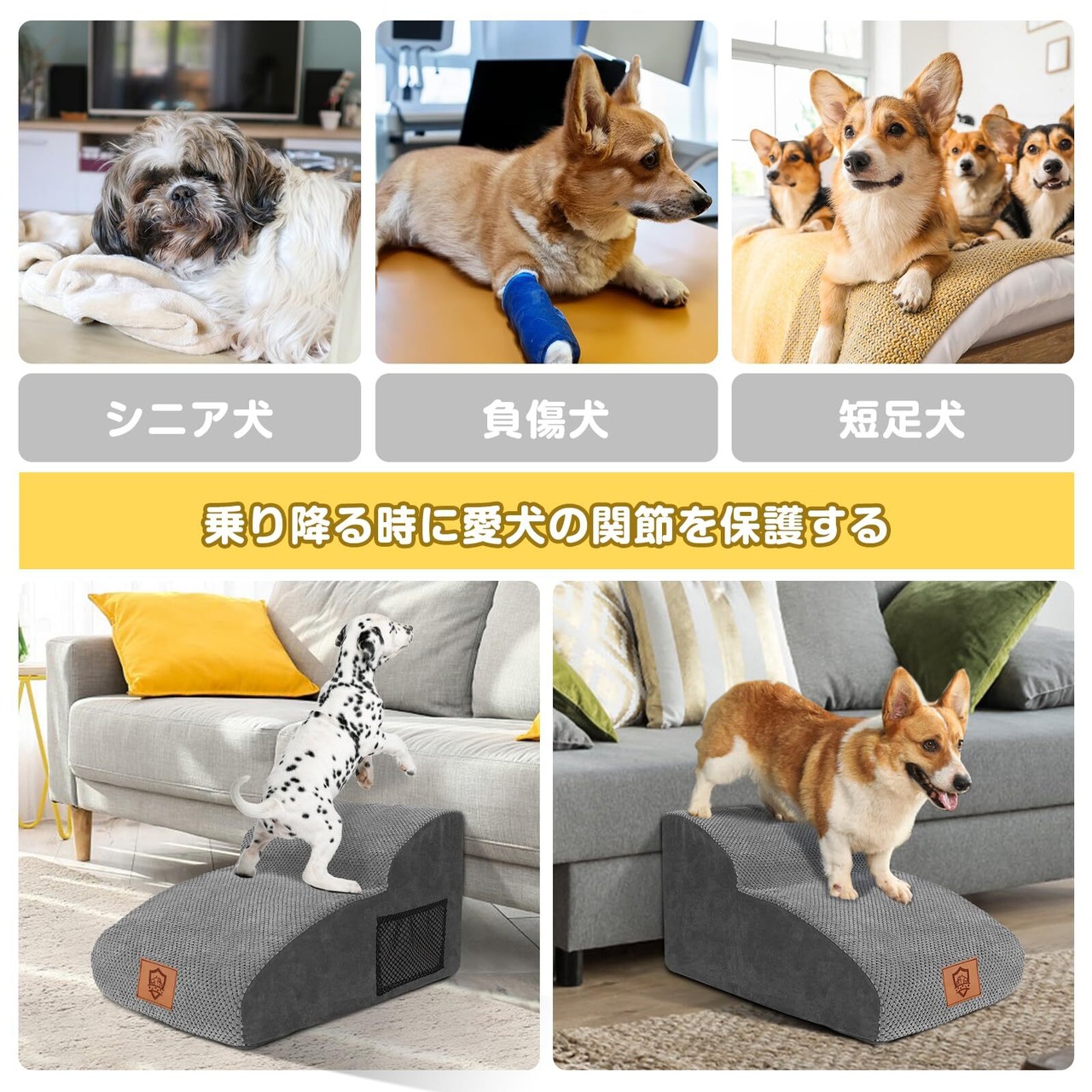 高齢犬を守り:ドッグステップは最大耐荷重22kgで、ほとんどの小型犬や中型犬に適しています。高齢犬、短足犬、怪我をした犬の関節の健康を保護します。ペット用階段はソファやベッド、窓のそばで使用でき、犬さや猫さんを飼い主に近づけることができます。