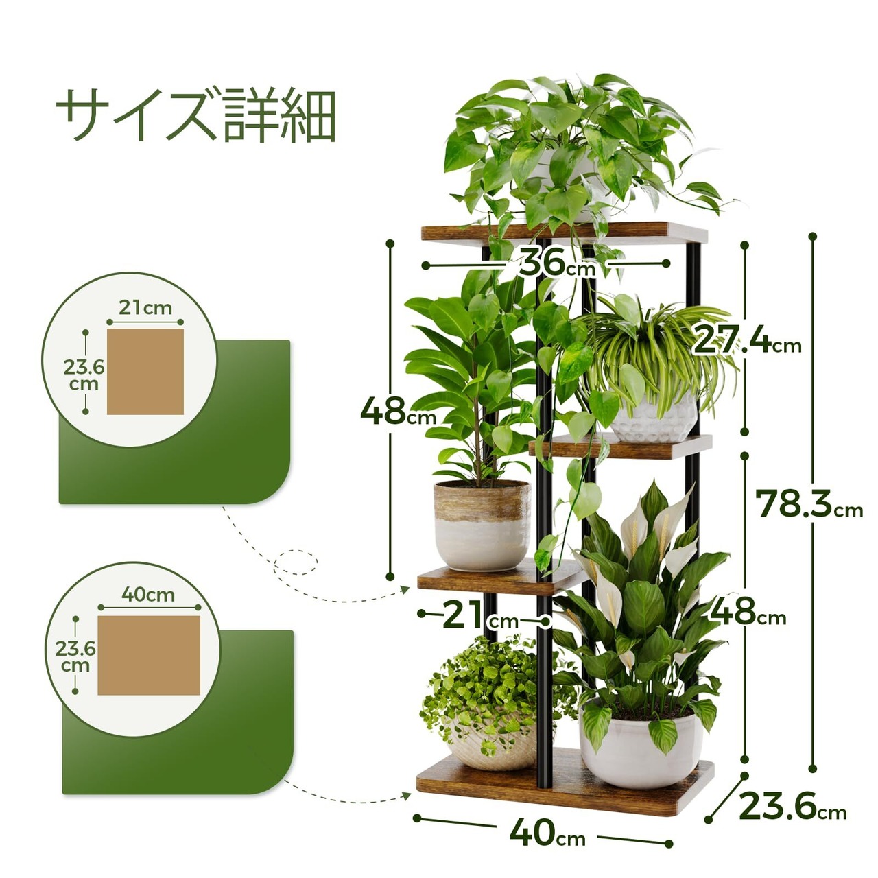 コンパクトサイズで狭い場所も活用可能:縦78cm×横40cm×奥行23.6cmの省スペースデザインで、植木鉢や観葉植物を垂直に収納。下段から上段まで4段のガーデニング棚構造を採用し、多層ラック式に配置することで空間効率最大化プランターラック