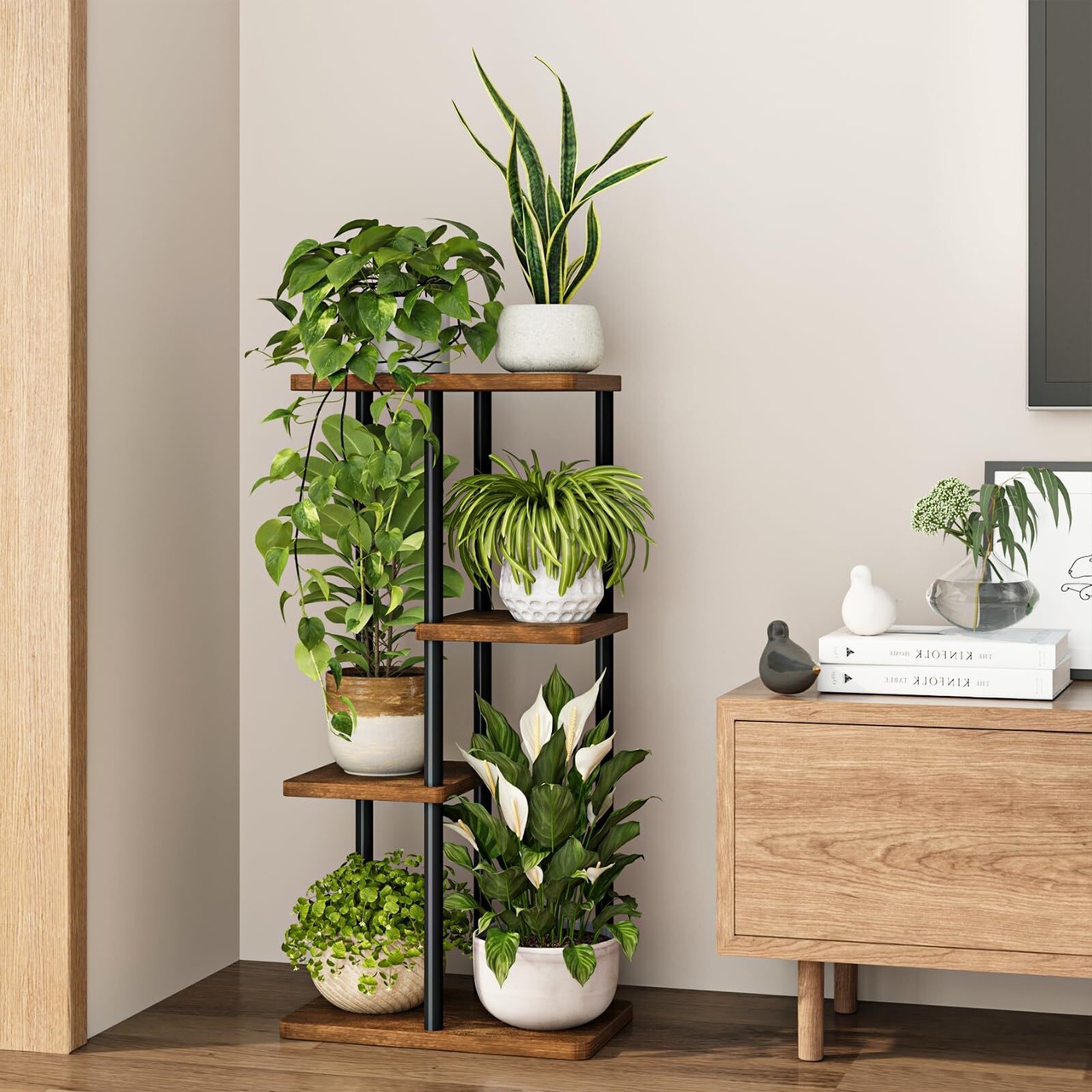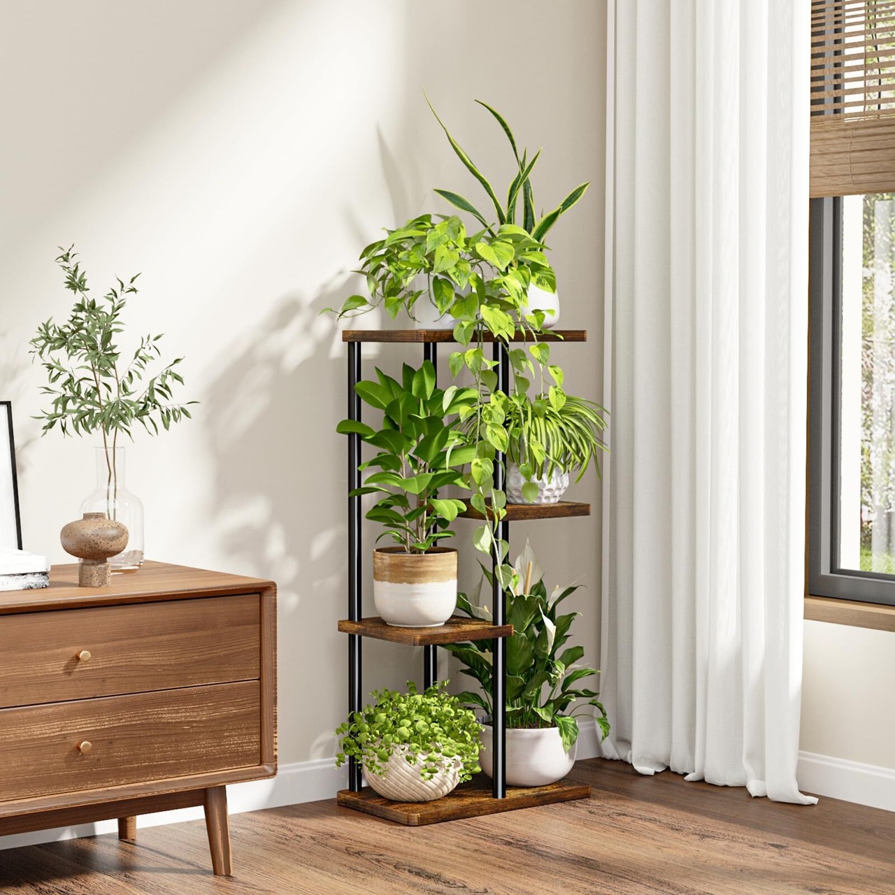 4段レイヤーで植物の層次感演出:多層式レイアウトで、下段から順番に花瓶・観葉植物・香り草・小物収納が可能!各段の高さ差を活かした配置で、天井光を効率的に受けられるため、植物の光合成が促進されます。縦長空間の家屋やコンパクトルームでも、視覚的に空きが広がるモダンな収納アイテムです