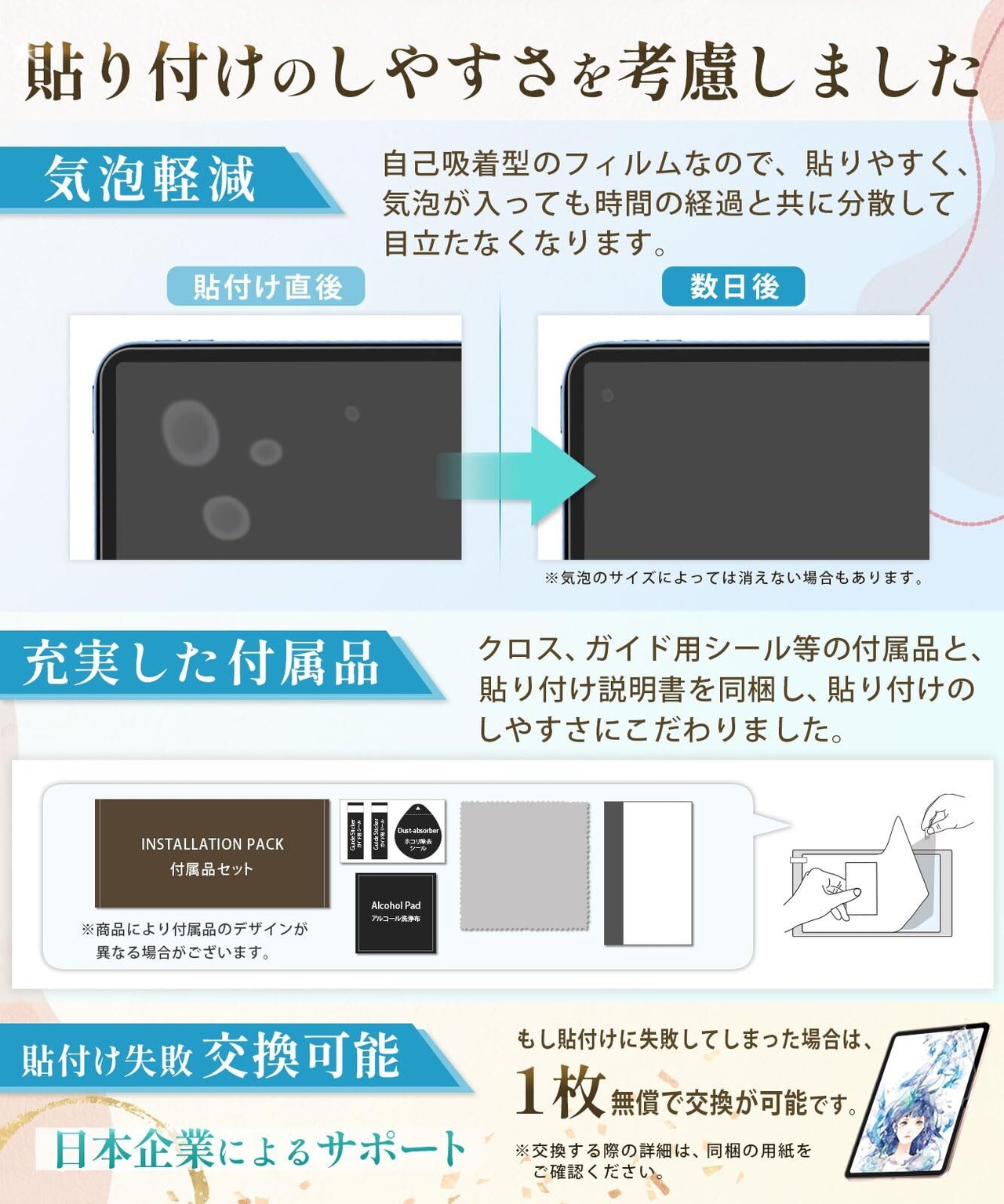 【貼り付け簡単】自己吸着タイプなので接着剤や両面テープを使わずにアイパッドの液晶画面への貼り付けが可能。フィルムを貼った後、気泡が残っても、時間の経過とともに分散するため、数日経てば、気泡は目立たなく消えたようになります。※気泡サイズにより消えない場合もございます。