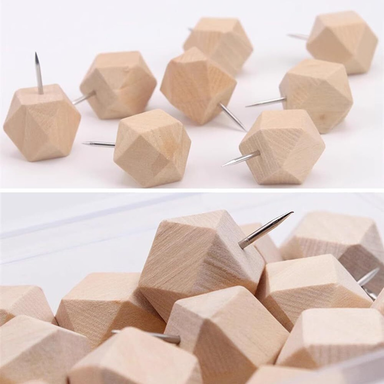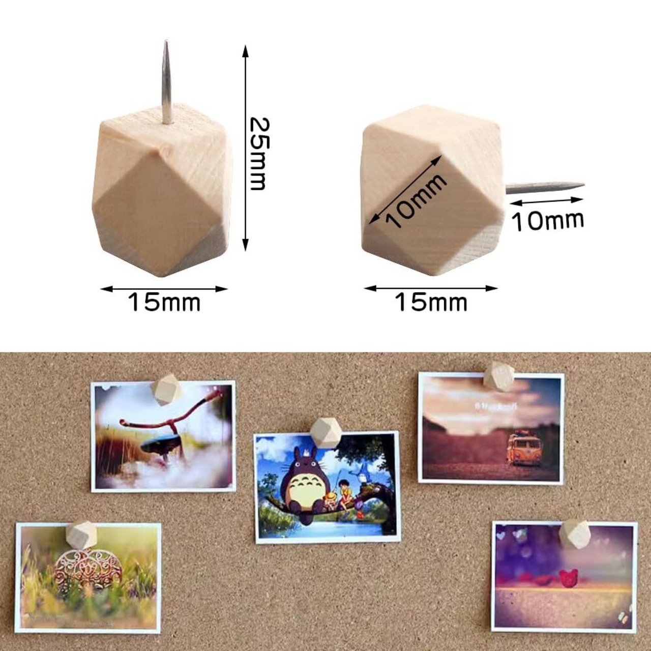 【多角形の木製画鋲】サイズは通常の画鋲よりも大きく、写真の展示だけでなく、イヤリング、ネックレス、キーホルダーなどのアクセサリを収納するためにも使用することができます。