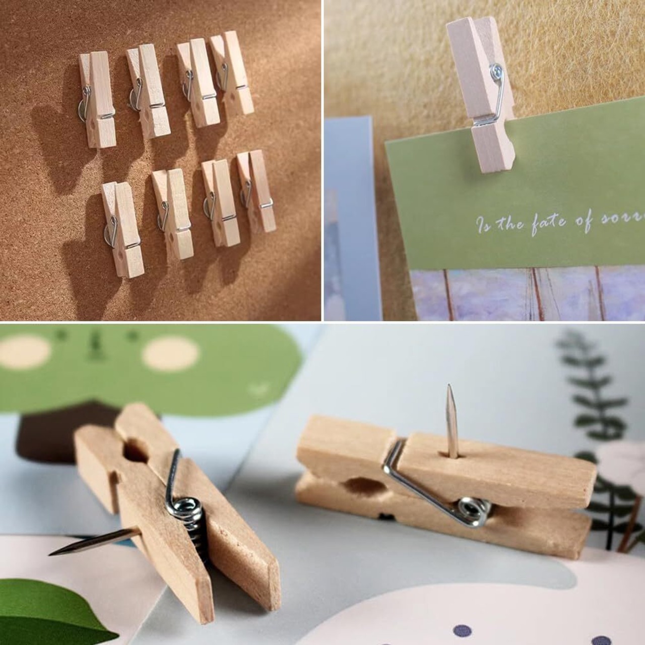 【ピン付き木製クリップ】木製のクリップには裏側にピンが付いており、それをコルクボードに挿して写真を傷つけずに飾ることができます。また、写真の交換も簡単です。