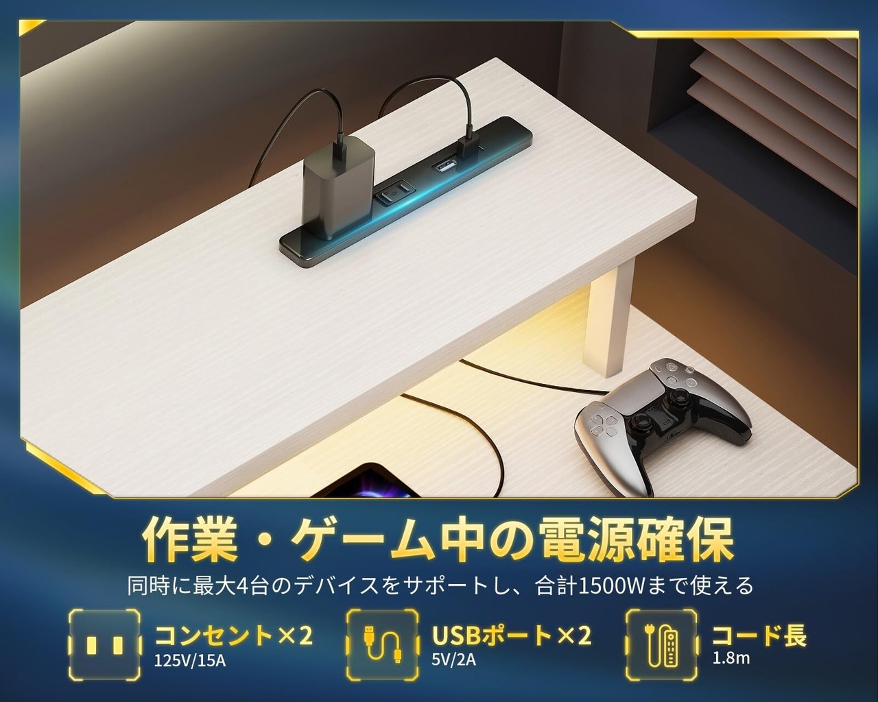 【コンセント付き、作業しながらの電源確保】デスクにはコンセント2口+USBポート2口が付いている。同時に最大4台のデバイスをサポートし、合計1500Wまで使える。手近なところで電源が取れ、スマホやタブレットなどの充電が便利になり、電池残量を気にせずに長時間の作業が可能。