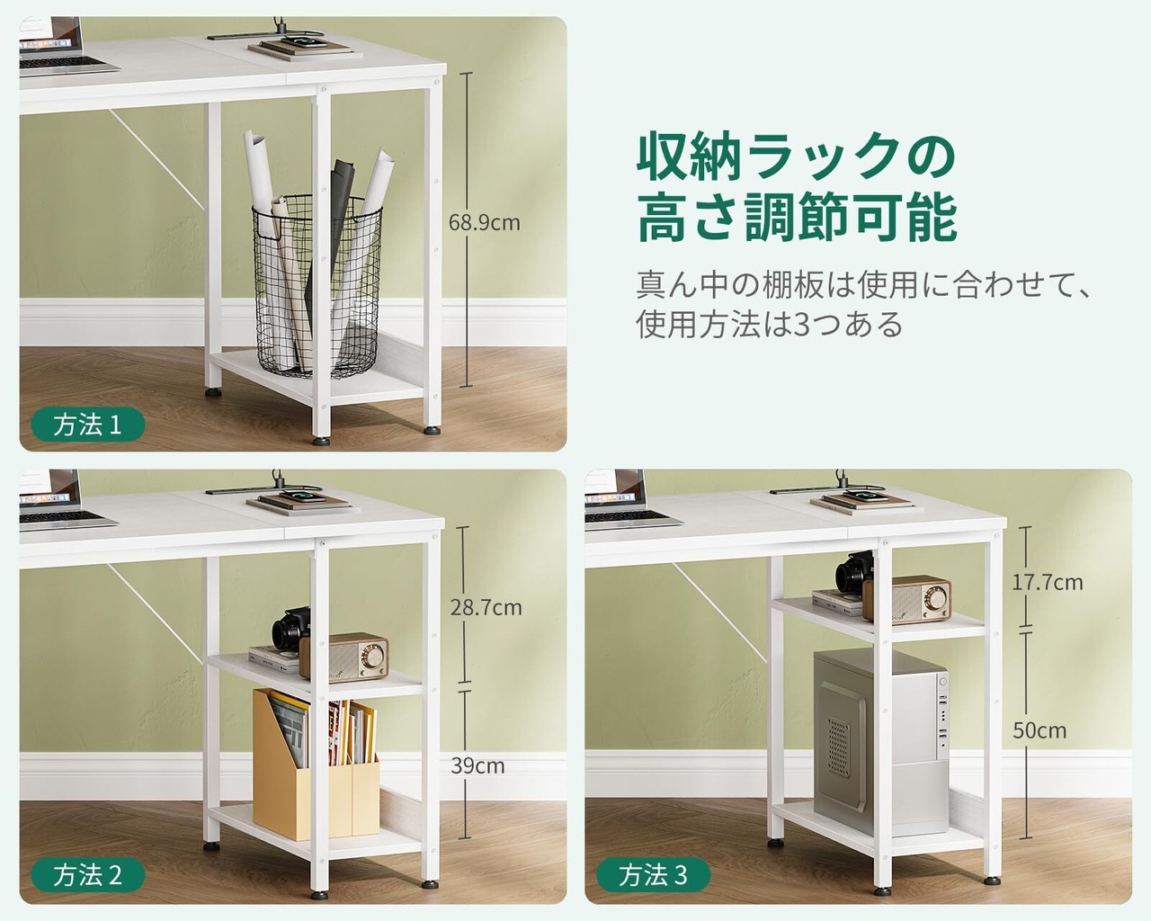 【両側収納力満載、多サイズの物の収納に適する】①ラックには棚板が2段あり、置くものに合わせて上段の棚板の位置が調節可能です。下段の棚板はCPUシェルフで、PCケースなど大きなものは収納できる。お好みに合わせて、ラックの部分は左右どちらにも設置OK。限られたスペースで効率的な収納を実現しています。②布製の引き出し3杯からなるキャビネットのような収納空間は限られた空間で収納効率が大幅にUP。MDFボードを内蔵した引き出しは重い物を入れても変形しにくい。同時にプライバシーを保護し、ほこりが落ちるのを防ぐ。小物から書類、本、アクセサリーまでたっぷり収納可能。さらに、3段目の引き出しには通常より大きく、大型アイテムやA4ファイルなどお気に入りの雑貨も美しく収められます。散らかりがちなデスク周りをスッキリ整頓し、作業に集中できる空間を提供します。
