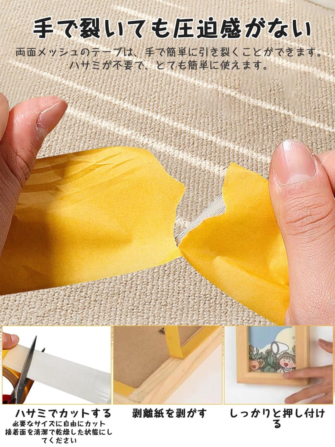 【手はけやすい】 両面テープは手で剥がせるように設計されており、ハサミやカッター工具を使わなくても手で剥がすことができます。注意点として、薄さと高い伸縮性のため、一度剥がすとテープが丸まりやすく、再利用不可。❉しっかりと粘着させるために、貼り付け後は10秒ほど押さえてください。