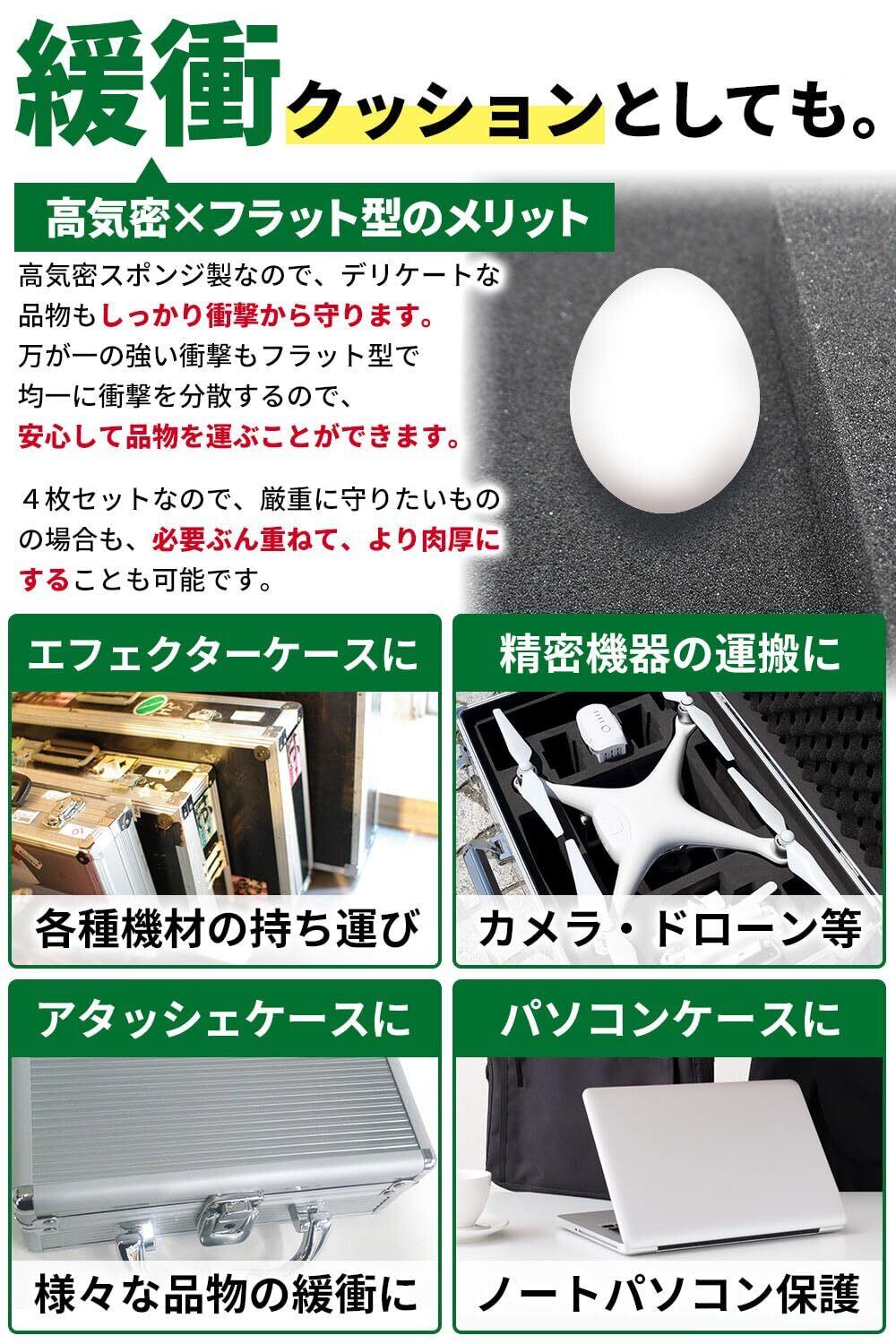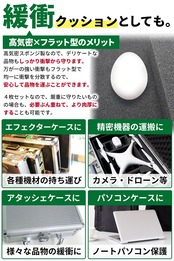 【 平型構造で包み込むような衝撃吸収 】平型構造がまんべんなくクッションとして大切な物をしっかり守ります。 エフェクターケース 、 カメラケース 、 アタッシュケース 、 パソコン の収納の 衝撃保護材 として。 水槽 や バイク の リアボックス の 振動防止材 として。水槽の自作ろ過フィルター、通風孔の埃侵入防止材として。単純な製品だからこそ様々な用途にご使用できます。