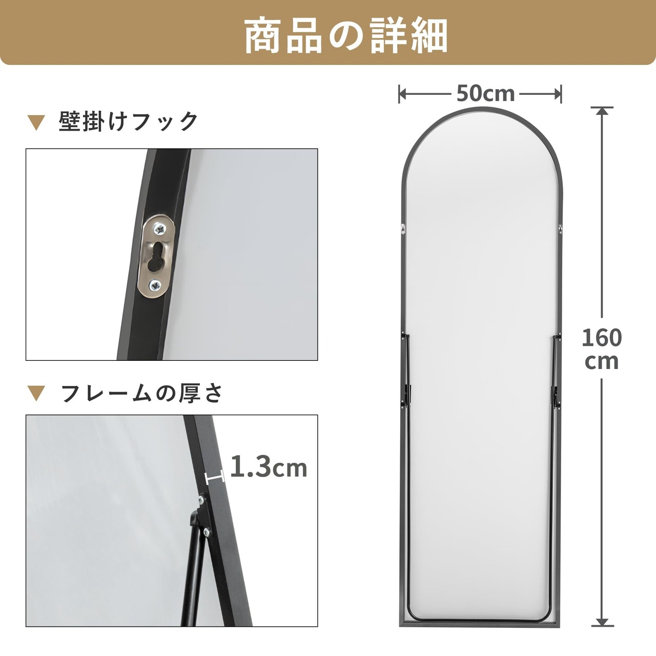 ミルオ君の鏡工房 姿見鏡 全身鏡 スタンドミラー 壁掛け アーチ型 3way スタンド付き 全身ミラー おしゃれ アルミフレーム 飛散防止加工済み 北欧風 160x50cm ブラック