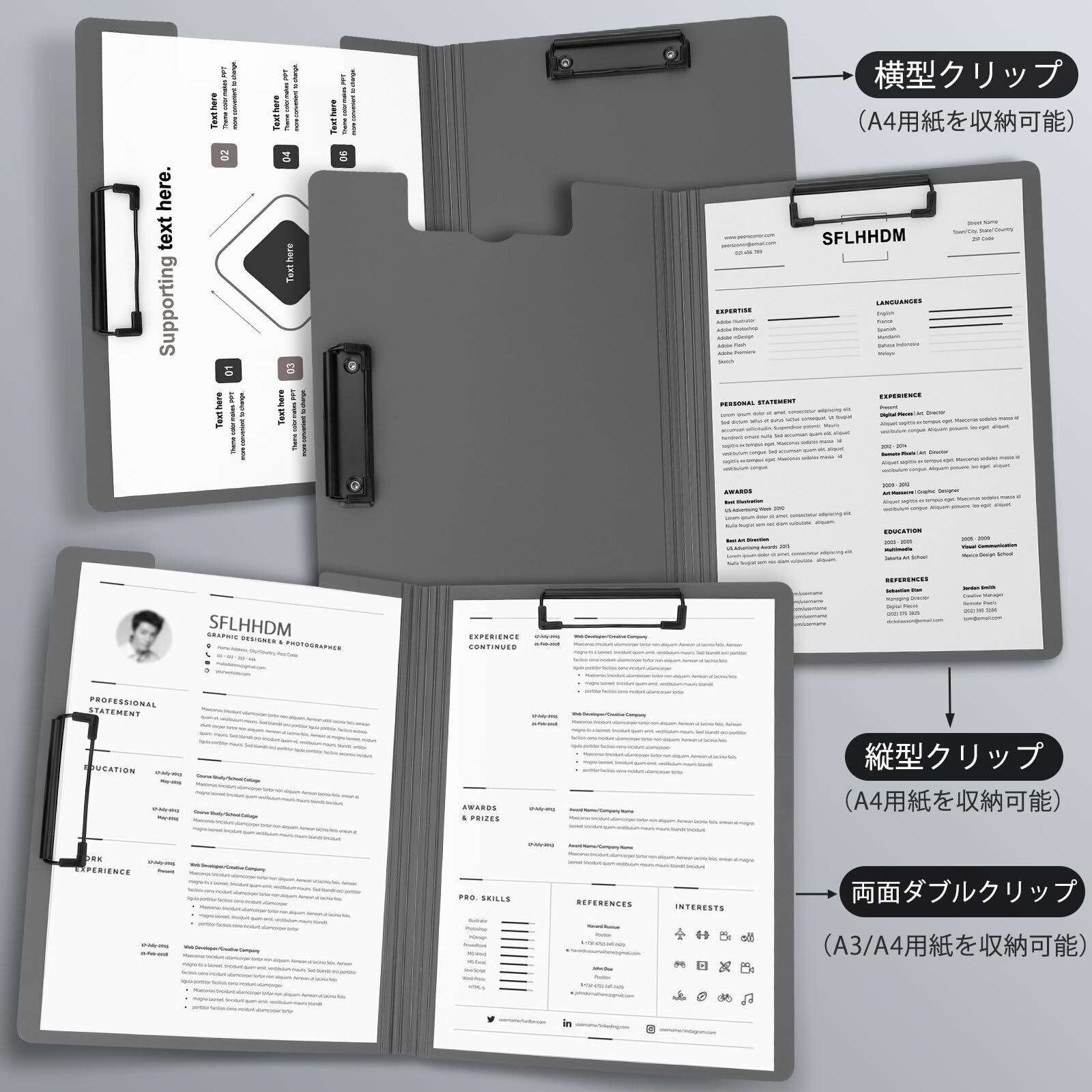 多機能クリップボード: A4/A3サイズ対応の2つ折りクリップボード。横型・縦型クリップ付きで様々な書類サイズに対応