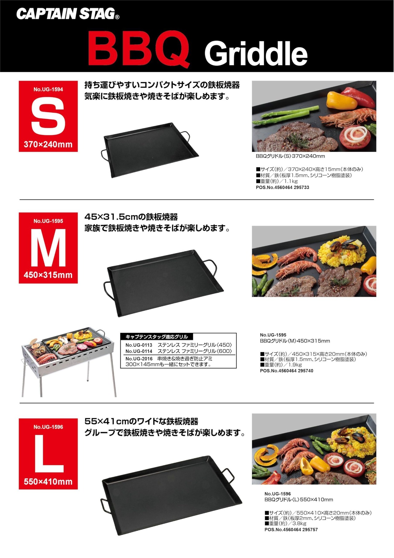 キャプテンスタッグ対応グリル:UG-113 ステンレスファミリーグリル(450)、UG-114 ステンレスファミリーグリル(600)、キャプテンスタッグ対応商品:UG-2016 串焼き&焼き過ぎ防止アミ 300×145mm
