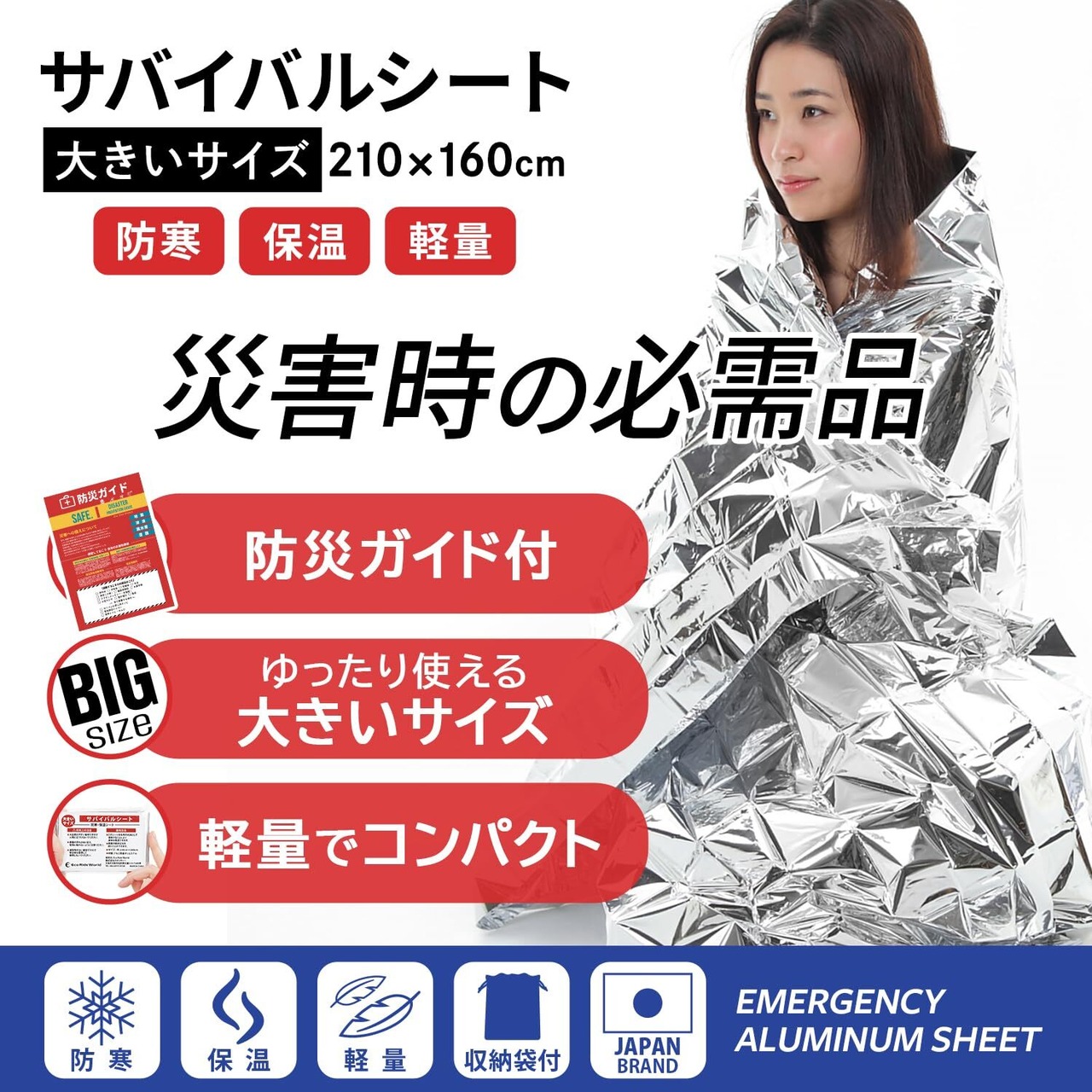 災害時やアウトドア、スポーツ観戦時などにブランケットの代用としてご使用いただけるコンパクトなサバイバルシート (アルミシート) です。 急な気温変化や災害などの緊急時に対応するために開発されたアルミの簡易毛布(エマージェンシーシート)です。 薄く小さく折りたたまれているので、 日常のかばんや防災リュック、車の中などに常備でき、持ち運びやすく場所を取りません。防災ガイドを付属しており、非常持出品チェックリストや緊急ダイヤルなど災害への備えについて 必要な情報が提供されています。またコンパクトに収納できるよう専用のポーチを付属しています。