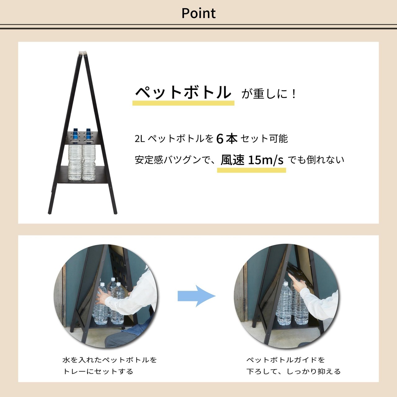 2リットルのペットボトルを6本設置可能、追加の重し対策が不要です