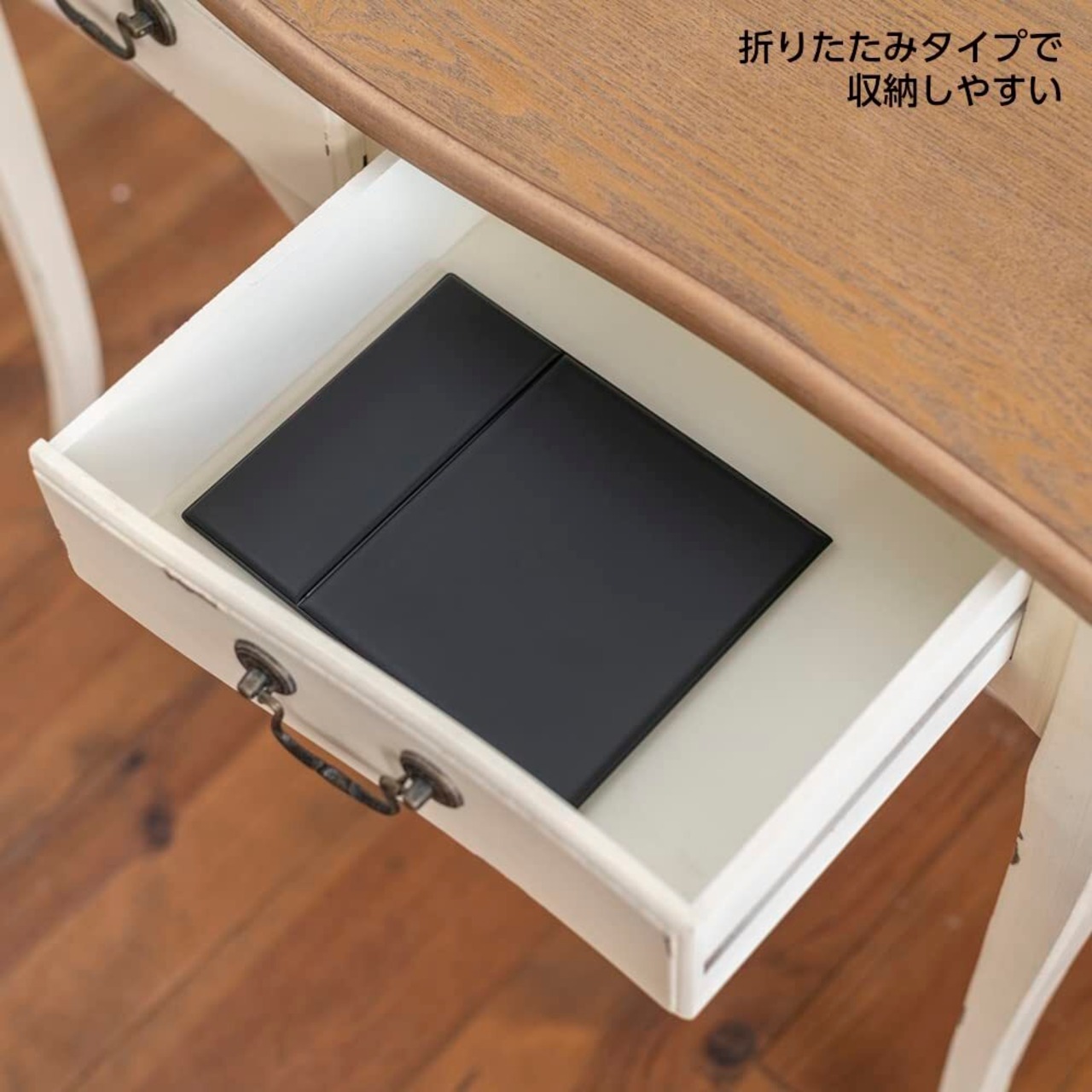 【軽量・コンパクト】従来の折りたたみミラー(当社比)よりも薄く軽いので、場所をとらずコンパクトに収納でき、引き出しやバッグに入れても邪魔になりません。旅行やお出かけ時など持ち運びに便利です。B5サイズのノートとほぼ同じサイズ。お顔全体が映りますので、ご自宅でのメイクに最適なサイズです。サイズ17.6cm×22.5cm、厚み0.85cm、重量約370g