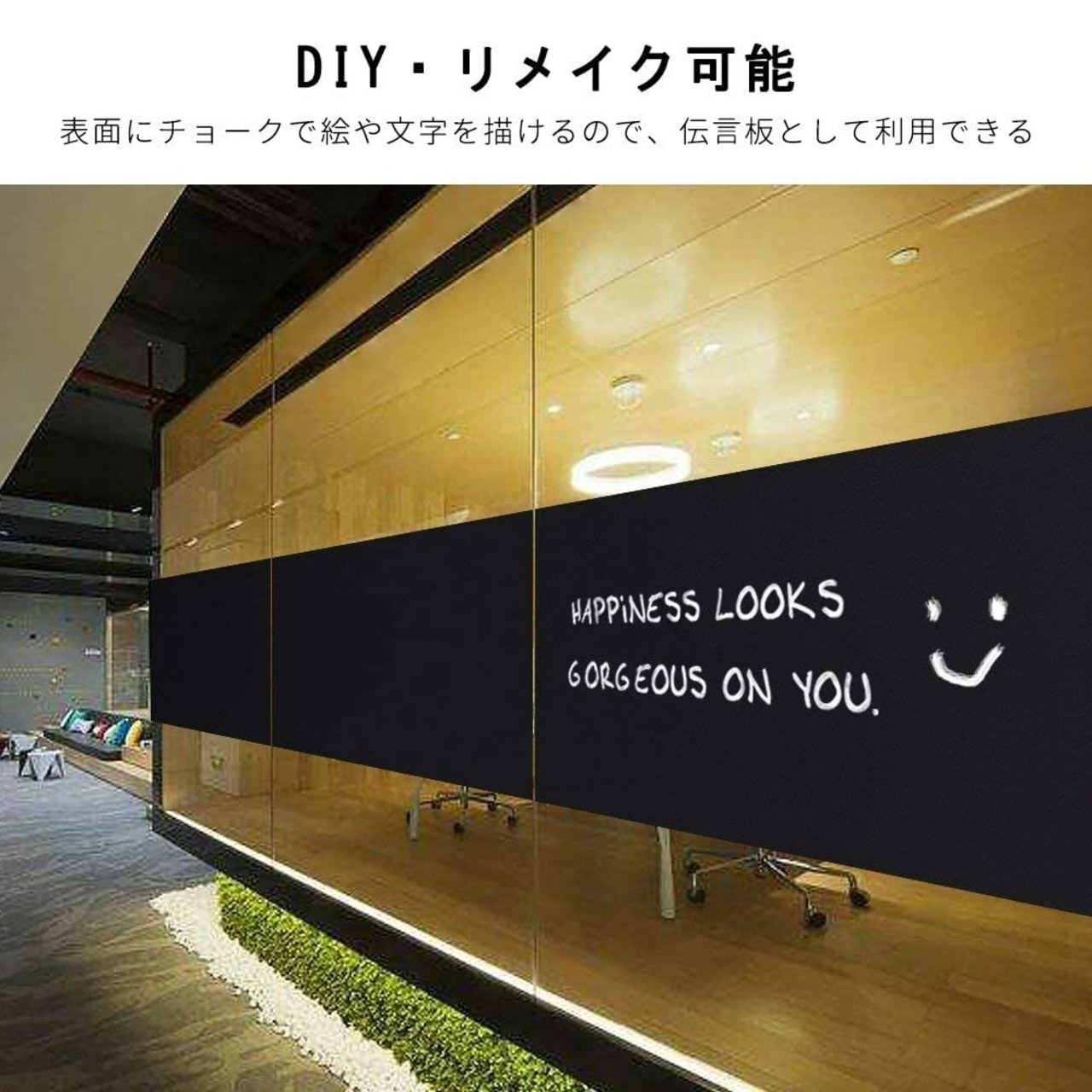 伝言板・リメイク可能:キレイめがお好きなお客様にもオススメ!この真っ黒で98%不透明のフィルムは遮光性、目隠し効果が抜群な代わりに、見た目がやや地味ですが、上にチョークで絵や文字を描いたりできるので、伝言板として使えるだけではなく、ご自由にリメイクできます。