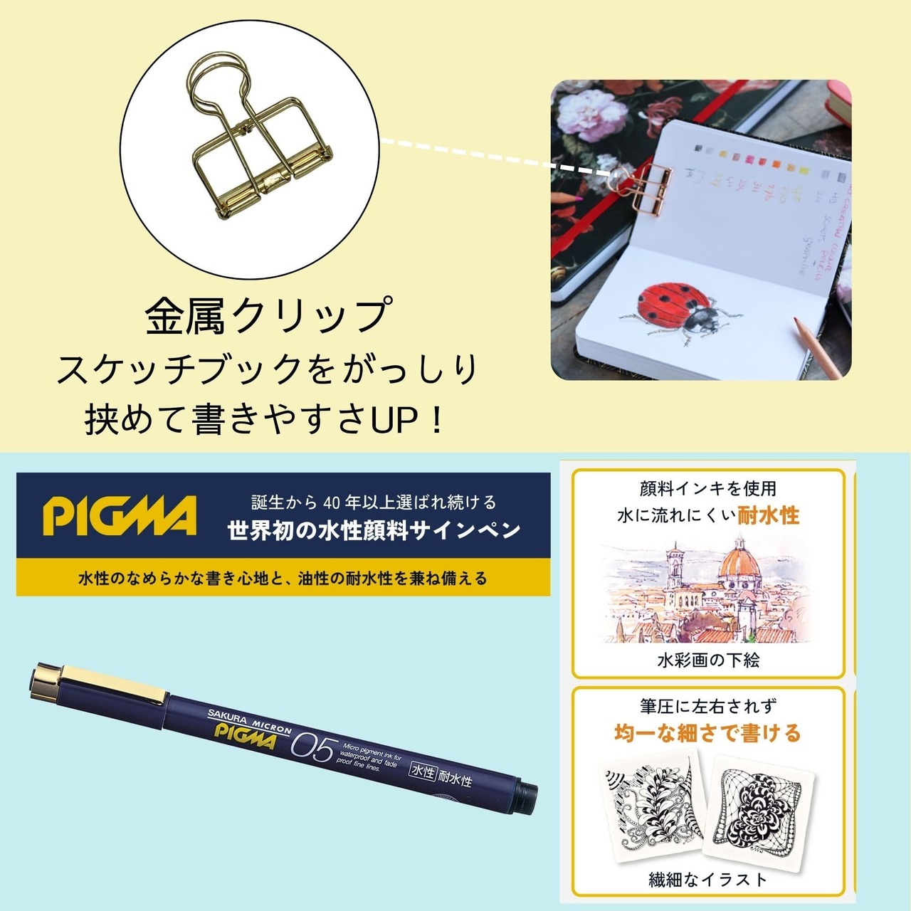 付属品:色鉛筆12色、ピグマ0.5黒、金属クリップ