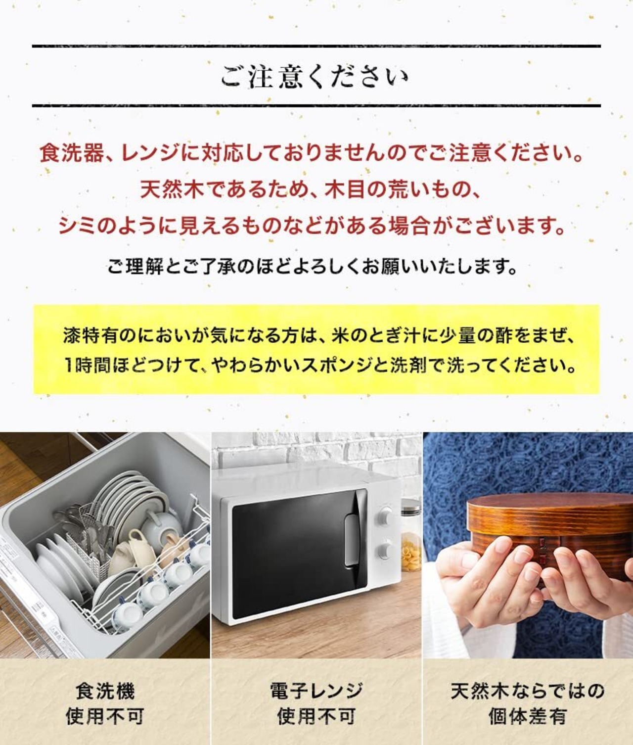 ご注意:木製(曲げわっぱ、くりぬき)弁当箱はすべて天然木であるため、木目が荒かったり、シミなどがある場合がございます。あくまでも「天然木のならではのよさ」でありますのでご理解とご了承のほどよろしくお願い致します。