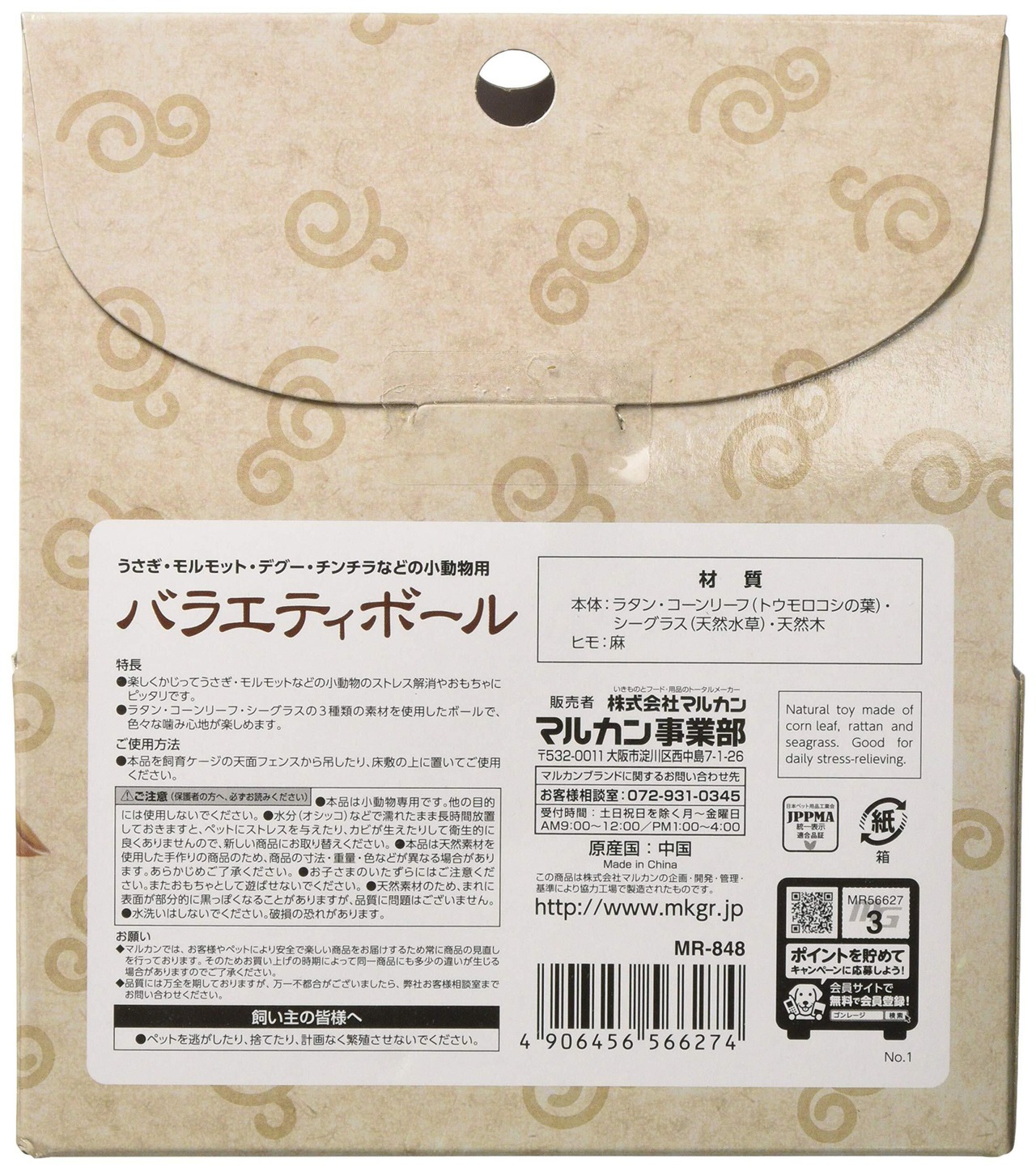 3種類の天然素材で作った噛み心地が楽しいボールです。楽しくかじって小動物のストレス解消やおもちゃにピッタリ。 使用方法 本品を飼育ケージの天面フェンスから吊るしたり、床敷の上に置いてご使用ください。