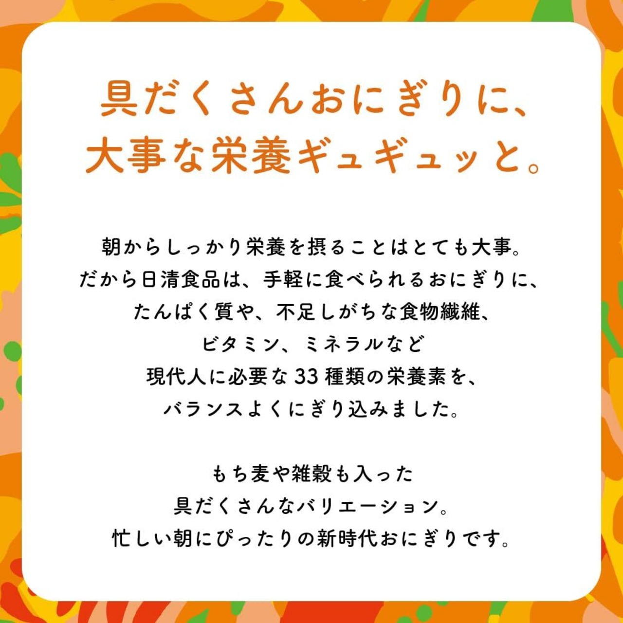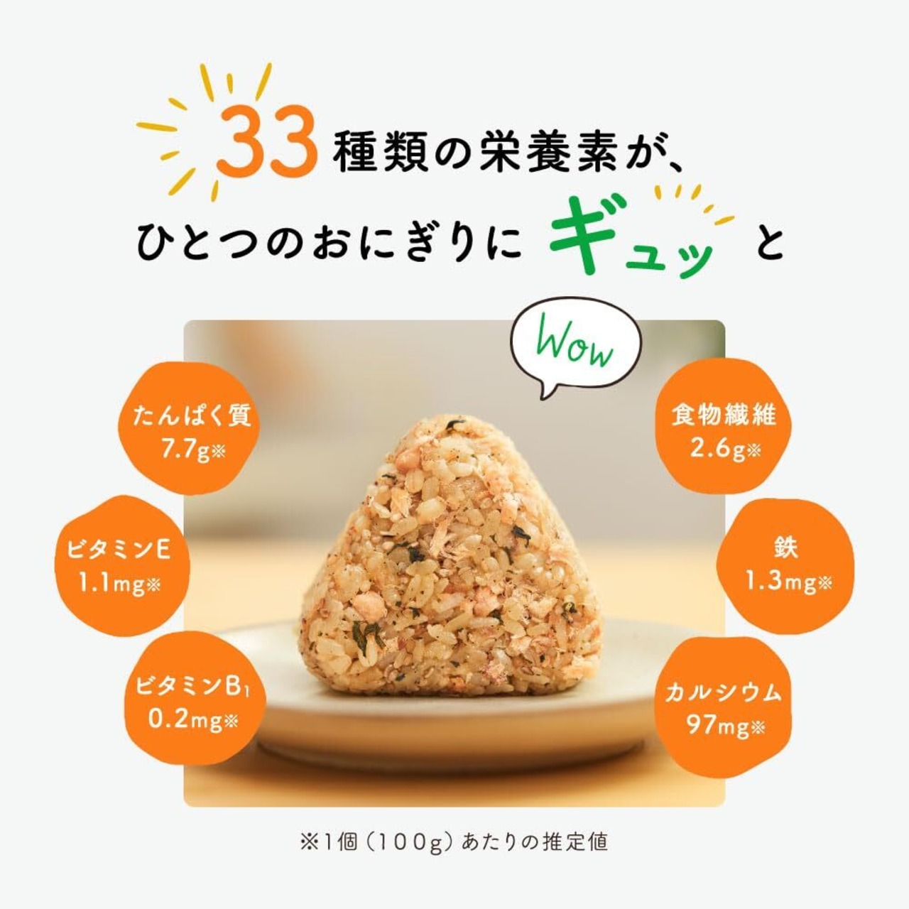 手軽に食べられるおにぎりに、糖質や、不足しがちな食物繊維、ビタミン、ミネラルなど現代人に必要な33種類の栄養素まで、バランスよくにぎり込みました。