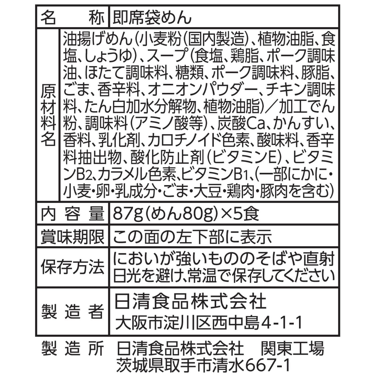油揚げめん(小麦粉(国内製造)、植物油脂、食塩、しょうゆ)、スープ(食塩、鶏脂、ポーク調味油、ほたて調味料、糖類、ポーク調味料、豚脂、ごま、香辛料、オニオンパウダー、チキン調味料、たん白加水分解物、植物油脂)/加工でん粉、調味料(アミノ酸等)、炭酸Ca、かんすい、香料、乳化剤、カロチノイド色素、酸味料、香辛料抽出物、酸化防止剤(ビタミンE)、ビタミンB2、カラメル色素、ビタミンB1、(一部にかに・小麦・卵・乳成分・ごま・大豆・鶏肉・豚肉を含む)