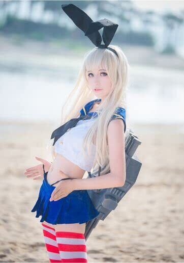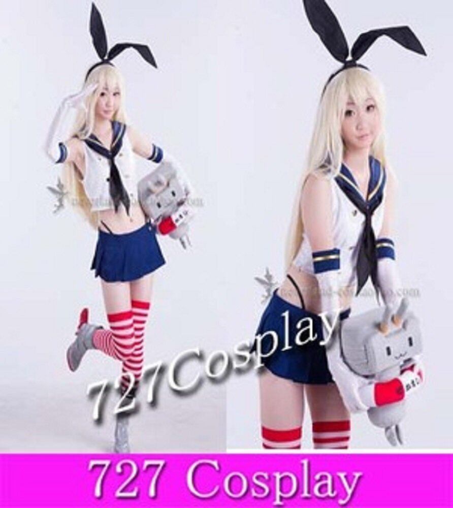 COSMOS_K 艦隊これくしょん 島風 コスプレ 7点セット セーラー服 + スカート + 紐パンツ + 兎耳カチューシャ + スカーフ + グローブ + ハイソックス