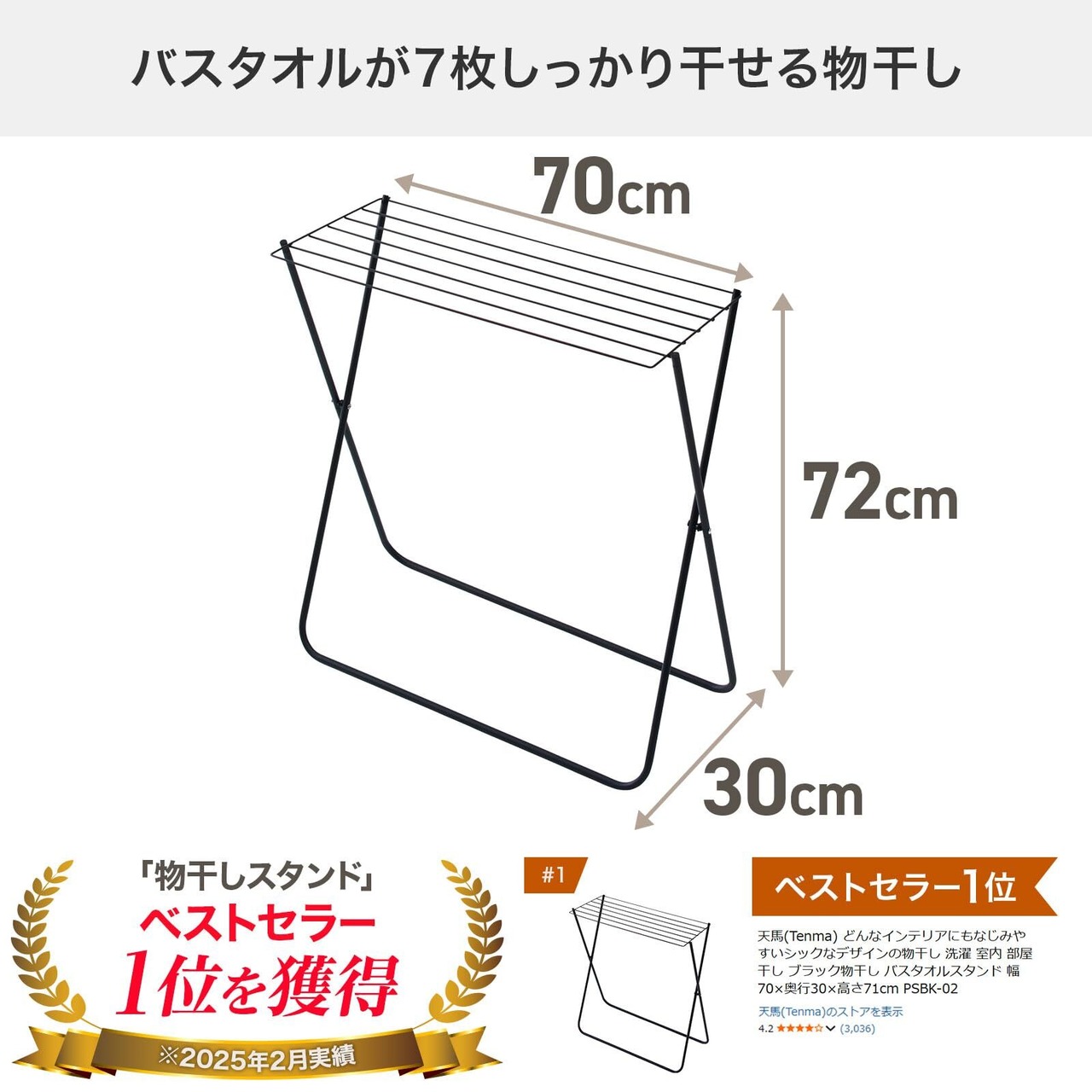 天馬(Tenma) どんなインテリアにもなじみやすいシックなデザインの物干し 洗濯 室内 部屋干し ブラック物干し バスタオルスタンド 幅70×奥行30×高さ71cm PSBK-02