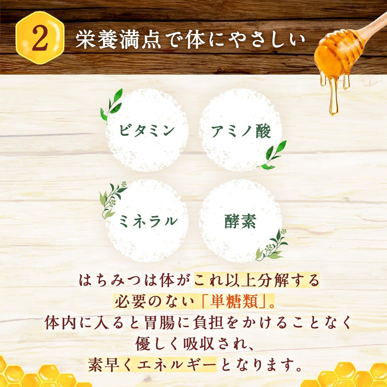 【健康と美容に濃厚なハチミツ】美肌のビタミンで知られるビタミンB群、C群が豊富なので肌の新陳代謝を高め、美肌作りの手助けをしてくれます。ハチミツの潤いと保湿に注目して「はちみつパック」を取り入れている方もいる程です。栄養価が高い蜂蜜は胃腸に負担をかけることなく優しく吸収され、素早くエネルギーとなります。
