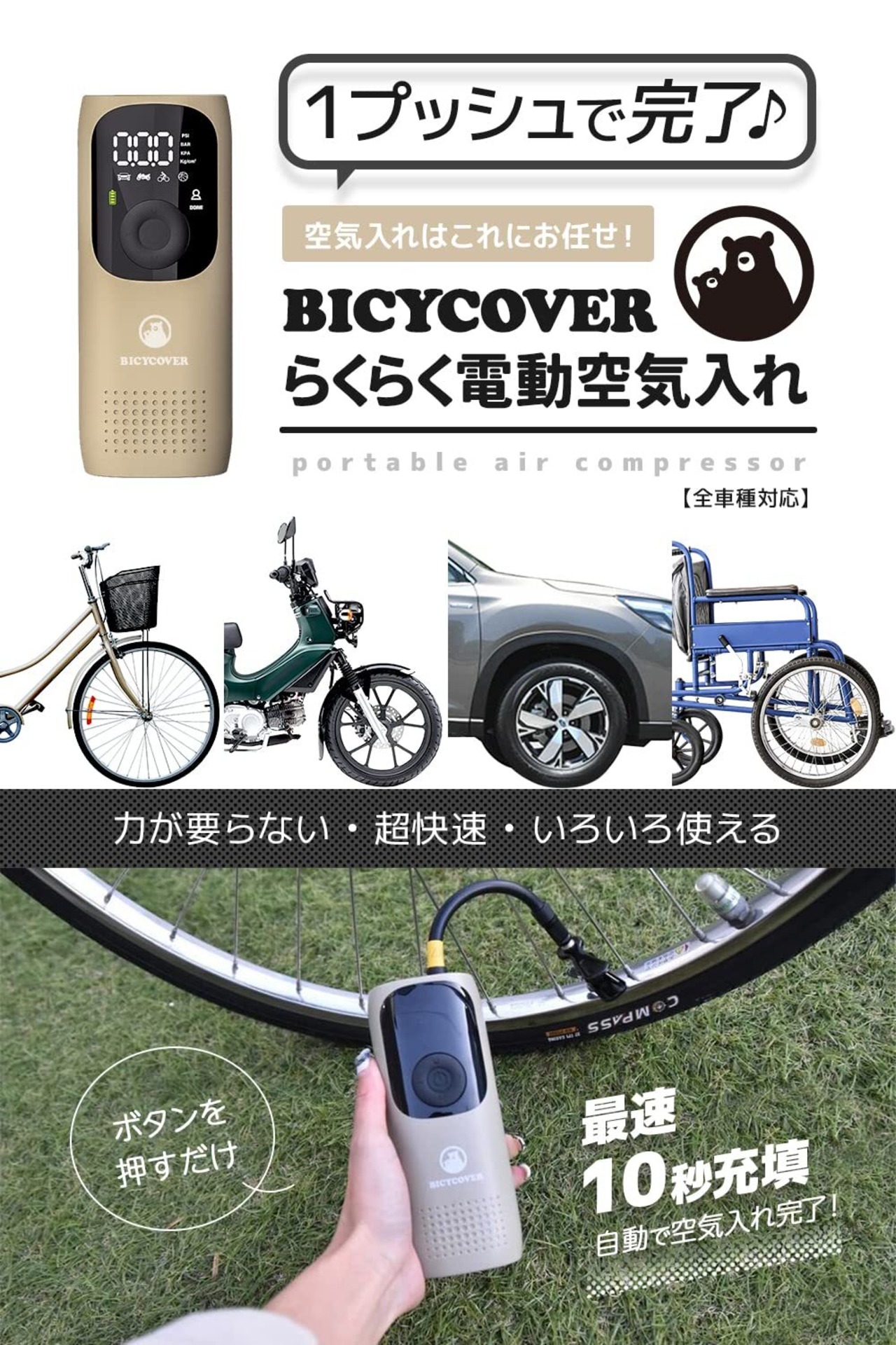 BICYCOVER(バイシカバー) バッテリー式 電動空気入れ 全バルブ対応 自転車 ママチャリ コンパクト 英式 仏式 米式 軽量 小型 サンドベージュ