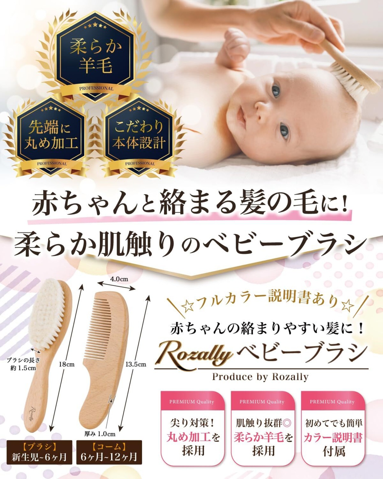 【保育士が監修】 Rozally ベビーブラシ がついに正式販売開始。 赤ちゃん の 髪の毛 がボサボサになる…というお客様の声から生まれた 髪の毛 を さらさら にする ベビー用ヘアブラシ です。 ベビーヘアブラシを使うことで、髪の毛 が 絡まない ように整えることができます。企画&設計では 乳児 や 新生児 の育児に詳しい【保育士】の先生からアドバイスをもらい、 クシ の尖りで頭皮が傷つかないような改良に加え、肌触り の良い「羊毛」と「天然木」を素材として採用致しました。