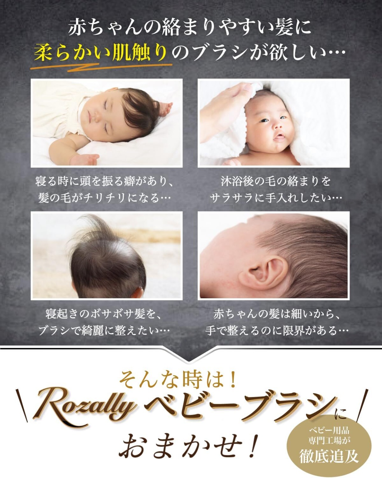【こだわり】様々なメーカーから 赤ちゃん用 や 乳幼児用 のブラシ用品として” ヘアブラシ ”が販売されていますが、Rozallyの ベビー用ブラシ は”こだわり”が一味違います。 赤ちゃん用ヘアブラシ や 赤ちゃん用ブラシ の関連製品 などメインに取り扱っている10社以上の工場からサンプルを取り寄せ、「肌触り×傷つけない先端加工」を一緒に試行錯誤して頂けた1社に絞って発注を行なっています。