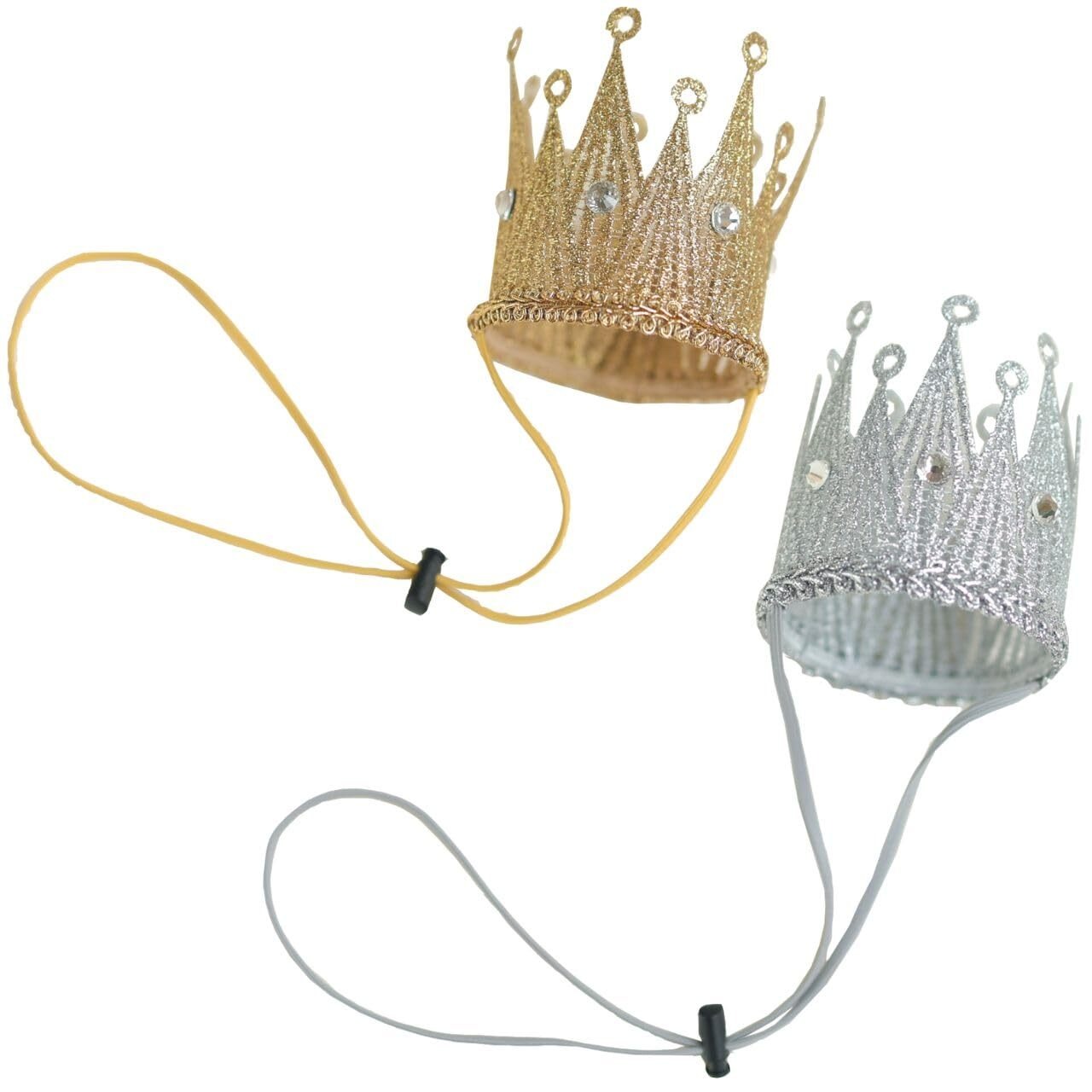 王冠セット(ゴールドとシルバーの2色)、サイズ:直径6.5cm、高さ6.5cm。紐の長さは約40cm。【対象年齢】0歳から5歳くらいまで(個人差があります)
