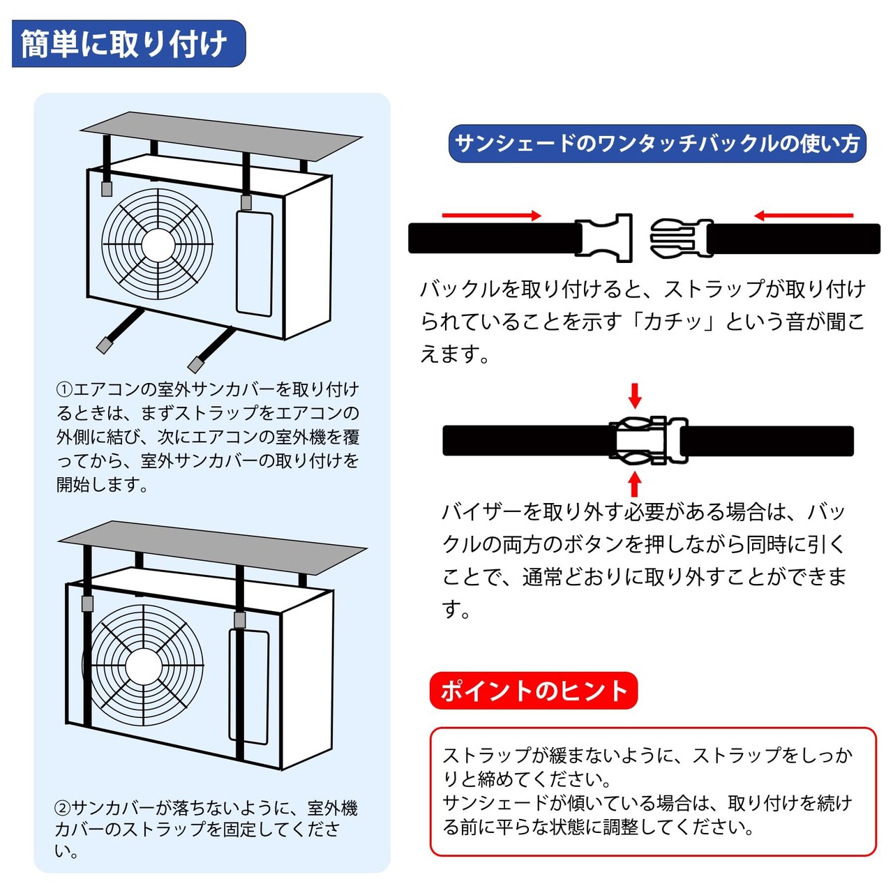 【取り付け簡単・四季通用】エアコン室外機カバーは高強度ベルトと幅4cmの特大自動バックルを採用しており、耐久性と弾力性があり、さまざまなサイズの室外機に適応します。一人でも簡単に装着でき、使わない時は折りたたんで収納できます。エアコン室外機カバー表面のアルミフィルムは防水性能が強く、内部は難燃性素材を採用しており、高温や梅雨時でもエアコン室外機を守ります。一年中、暑い日も、雨の日も、雪の日も、紅葉が舞い落ちる日も、エアコン室外機カバーがあなたのエアコン室外機を守ってくれます。